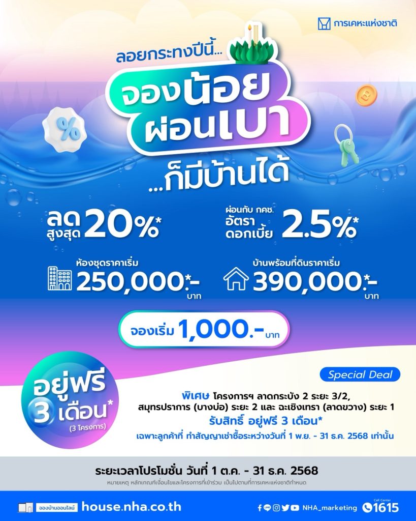 การเคหะแห่งชาติ จัดโปรพิเศษ “ลอยกระทงนี้…จองน้อย ผ่อนเบา ก็มีบ้านได้” ตั้งแต่บัดนี้ – 31 ธ.ค. 68
