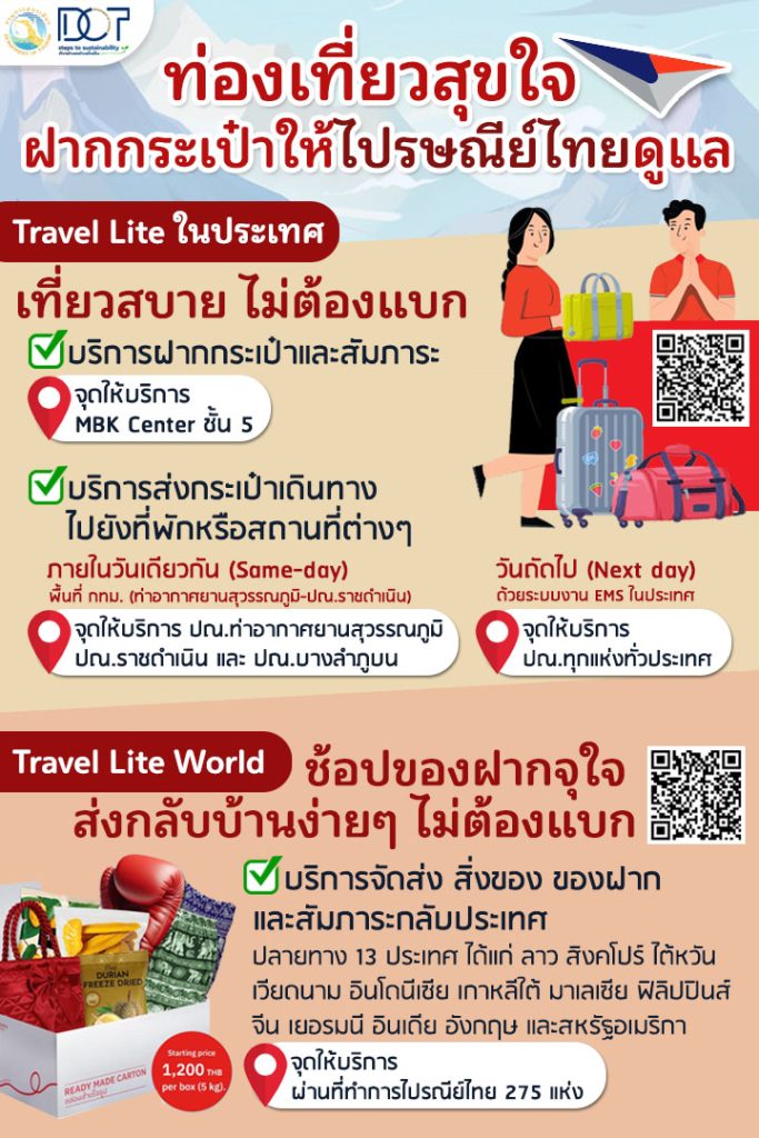 กรมการท่องเที่ยว แนะนำ ท่องเที่ยวสุขใจฝากกระเป๋าให้ไปรษณีย์ไทยดูแล โดยได้เปิดบริการจัดส่ง สิ่งของ ของฝาก และสัมภาระกับประเทศ ปลายทาง 13 ประเทศ ได้แก่ ลาว สิงคโปร์ ไต้หวัน เวียดนาม อินโดนีเซีย เกาหลีใต้ มาเลเซีย ฟิลิปปินส์ จีน เยอรมัน อินเดีย อังกฤษ และสหรัฐอเมริกา ที่จุด ให้บริการผ่านที่ทำการไปรษณีย์ไทย 275 แห่ง