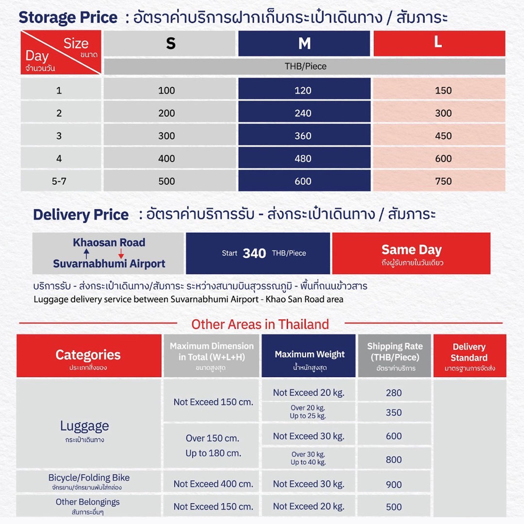 - บริการส่งกระเป๋าเดินทางไปยังที่พักหรือสถานที่ต่างๆ- ภายในวันเดียวกัน (Same-day) พื้นที่ กทม. (ท่าอากาศยานสุวรรณภูมิ-ปณ.ราชดำเนิน) ที่จุดให้บริการ ปณ. ท่าอากาศยานสุวรรณภูมิ ปณ.ราขดำเนิน และ ปณ.บางลำภูบน