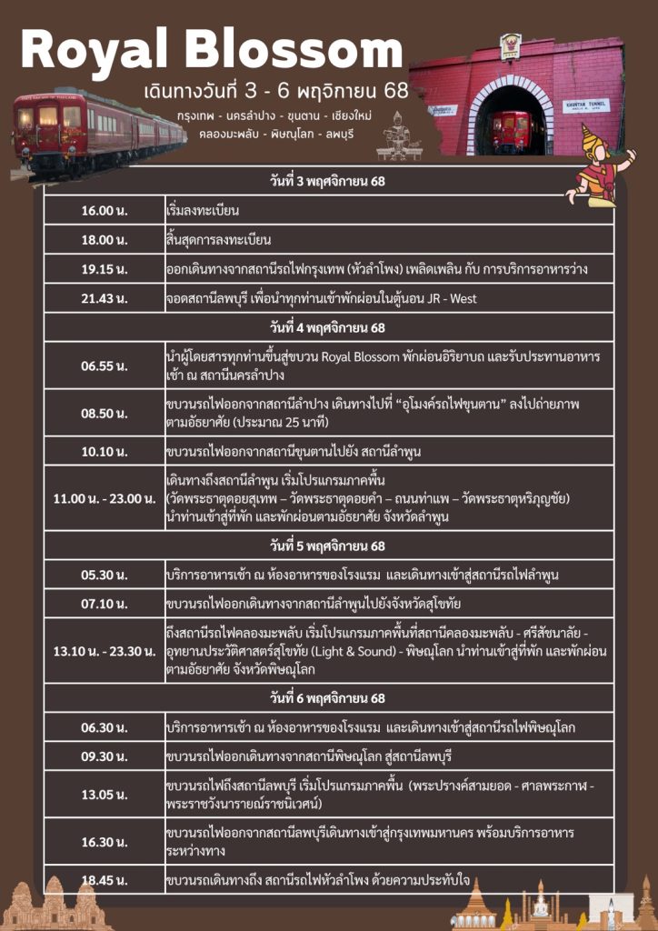 การรถไฟแห่งประเทศไทย ร่วมกับมหาวิทยาลัยราชภัฏลำปาง เปิดตัวโปรแกรมท่องเที่ยวสุดพิเศษ “Royal Blossom 3 เมือง 3 มนต์ขลัง ลอยประทีป สู่สามแผ่นดิน” ชวนประชาชนและนักท่องเที่ยว ร่วมเปิดประสบการณ์การเดินทางครั้งใหม่ บนขบวนรถไฟสุดหรู “Royal Blossom” สัมผัสมนต์เสน่ห์ 3 เมืองประวัติศาสตร์ ได้แก่ เชียงใหม่ – สุโขทัย – ลพบุรี ระหว่างวันที่ 3 – 6 พฤศจิกายน 2568 เปิดจำหน่ายตั๋วพร้อมกันทั่วประเทศ ตั้งแต่วันที่ 9 ตุลาคม 2568 เวลา 10.00 น. เป็นต้นไป