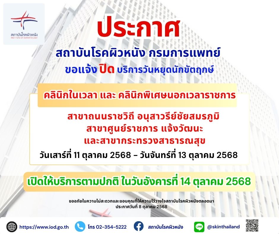 สถาบันโรคผิวหนัง แจ้งปิดบริการคลินิกในเวลา และคลินิกพิเศษนอกเวลาราชการ วันที่ 11 – 13 ตุลาคม 2568 ข่าวสารกิจกรรม สถาบันโรคผิวหนัง แจ้งปิดบริการคลินิกในเวลา และคลินิกพิเศษนอกเวลาราชการ วันที่ 11 – 13 ตุลาคม 2568 สถาบันโรคผิวหนัง แจ้งปิดบริการวันหยุดนักขัตฤกษ์ โดยงดให้บริการคลินิกในเวลา และคลินิกพิเศษนอกเวลาราชการ ดังนี้สาขาถนนราชวิถี อนุสาวรีย์ชัยสมรภูมิสาขาศูนย์ราชการ แจ้งวัฒนะสาขากระทรวงสาธารณสุข ในวันเสาร์ที่ 11 ตุลาคม 2568 – วันจันทร์ที่ 13 ตุลาคม 2568 เปิดให้บริการตามปกติ ในวันอังคารที่ 14 ตุลาคม 2568 ที่มา : Facebook สถาบันโรคผิวหนัง Post Views: 7 FacebookFacebookXTwitterLINELine