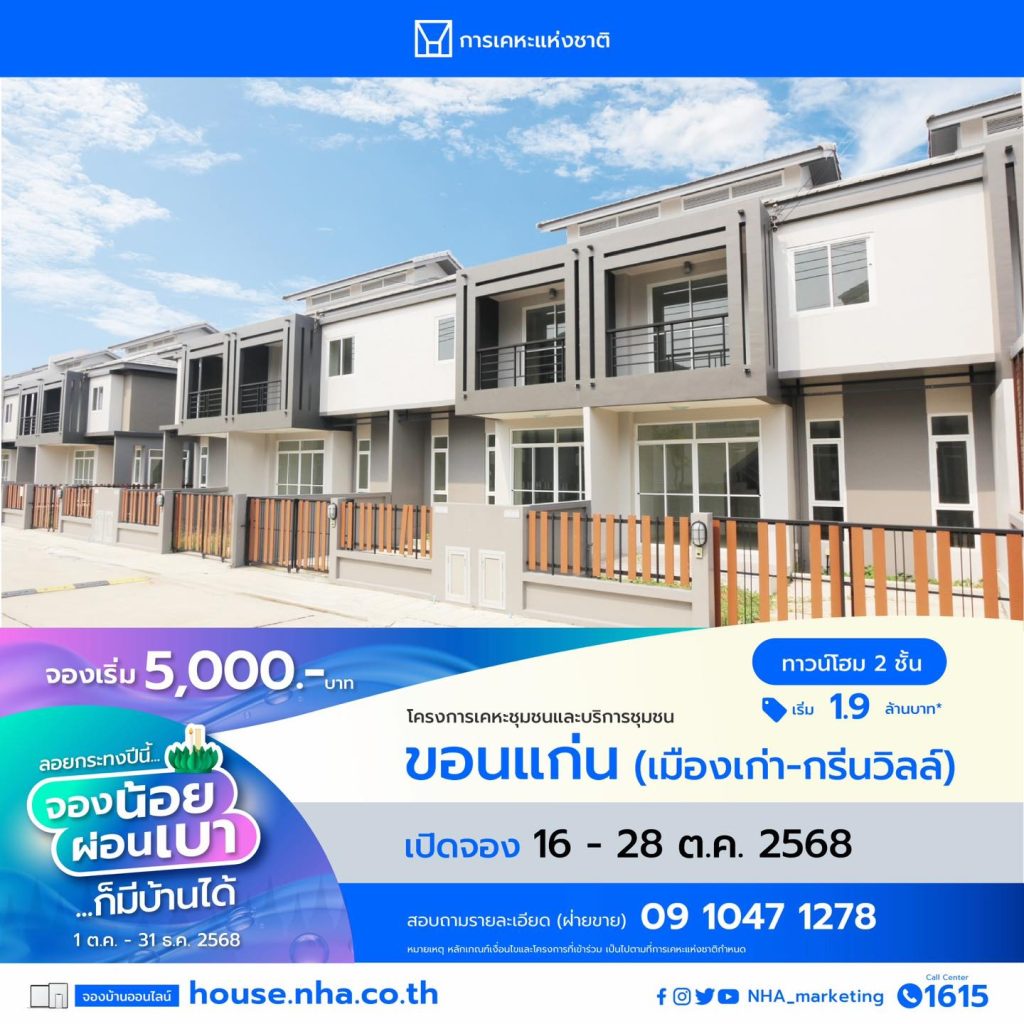 การเคหะแห่งชาติ เปิดจองโครงการเคหะชุมชนและบริการชุมชน ขอนแก่น (เมืองเก่า-กรีนวิลล์) 16 – 28 ต.ค. 68