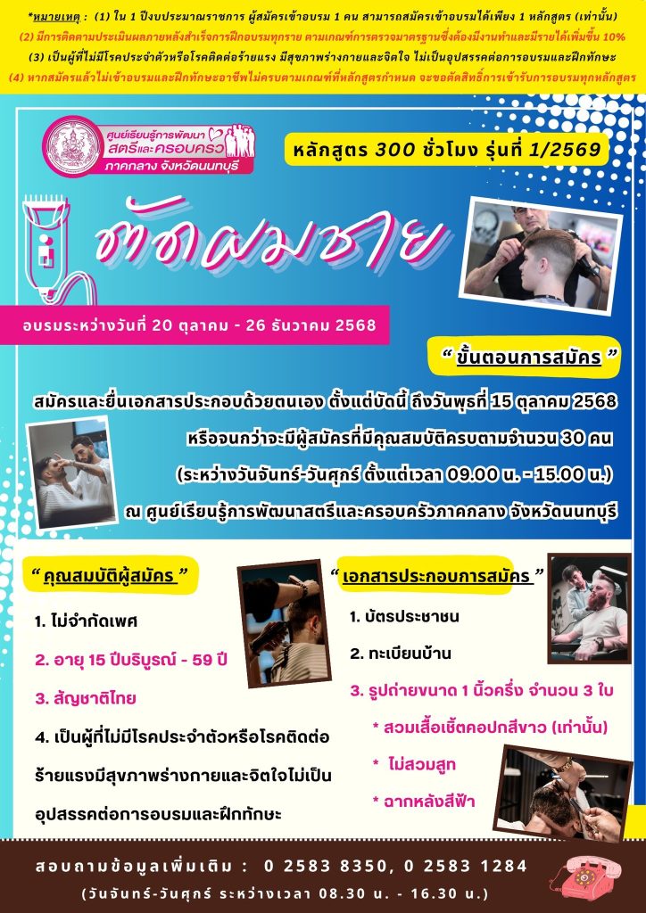 - ศูนย์เรียนรู้การพัฒนาสตรีและครอบครัวภาคกลาง จังหวัดนนทบุรี เปิดรับสมัครหลักสูตร 300 ชั่วโมง รุ่นที่ 1 ประจำปีงบประมาณ 2569 (ตัดผมชาย)