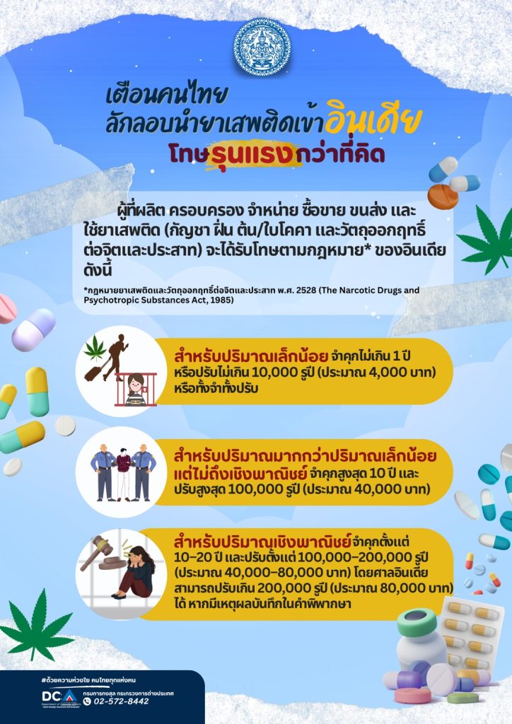 กรมการกงสุล เตือนคนไทยลักลอบนำยาเสพติดเข้าอินเดีย โทษรุนแรงกว่าที่คิด ผู้กระทำผิดตามกฎหมายยาเสพติดและวัตถุออกฤทธิ์ต่อจิตและประสาท พ.ศ. 2528 ของอินเดีย มีโทษดังนี้