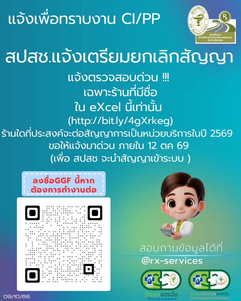 • ทั้งนี้ ร้านยาที่มีรายชื่อในไฟล์ตรวจสอบ หากประสงค์ดำเนินการต่อให้ลงข้อมูลในนี้ https://forms.gle/9xJEcSRNFfcwPXzR8