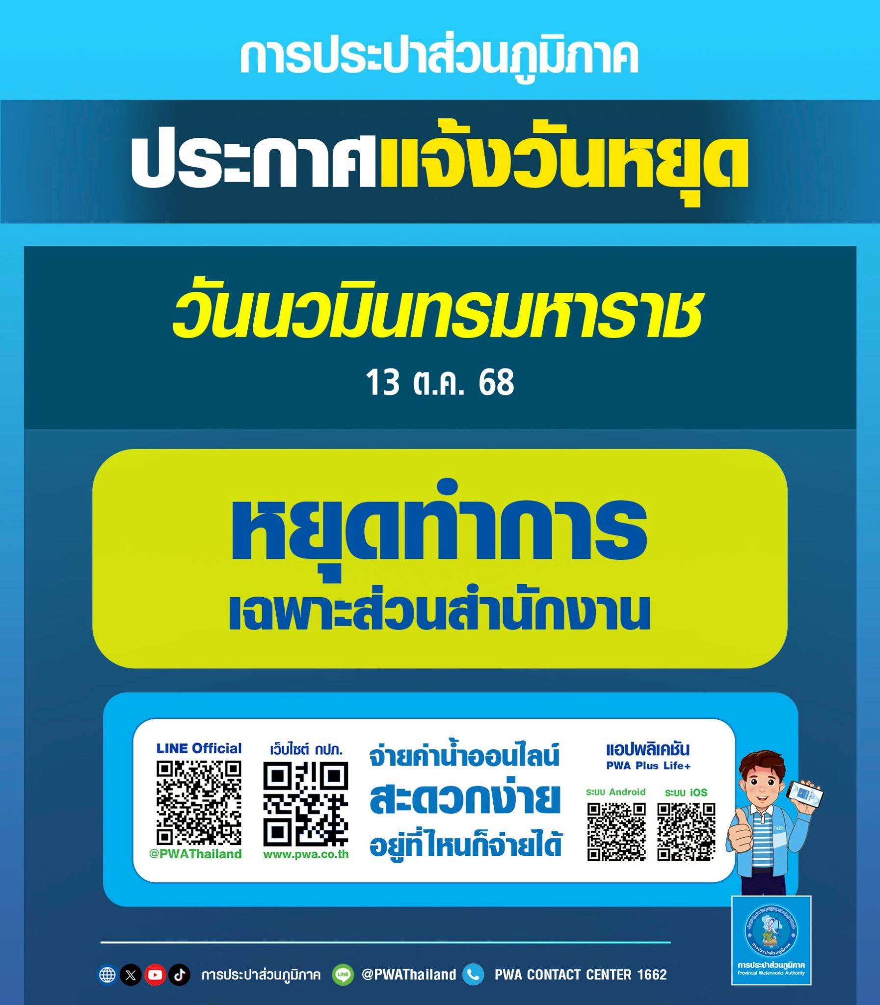 • การประปาส่วนภูมิภาค แจ้งปิดทำการเฉพาะส่วนสำนักงาน วันที่ 13 ตุลาคม 2568 เนื่องในวันนวมินทรมหาราช