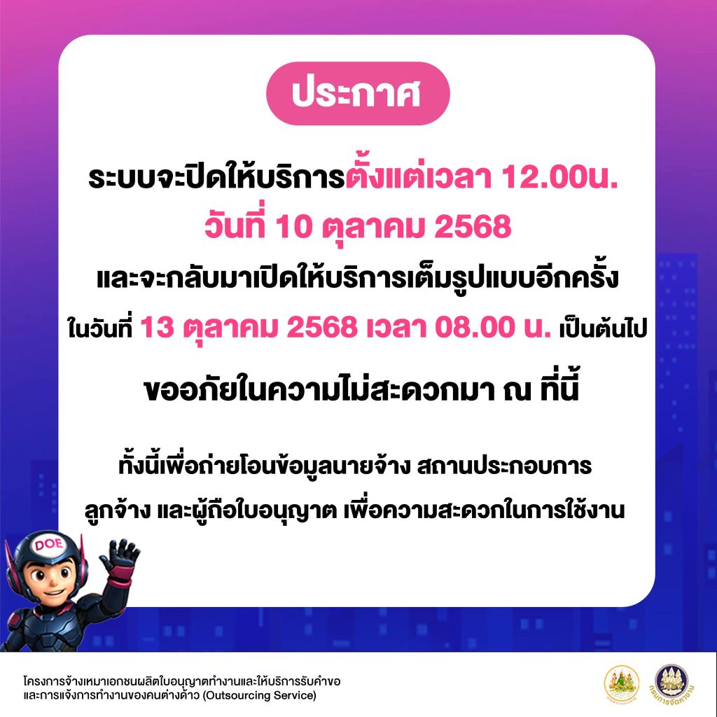 กรมการจัดหางาน แจ้งปิดระบบการให้บริการเว็บไซต์ e-WorkPermit ตั้งแต่วันที่ 10 – 13 ตุลาคม 2568