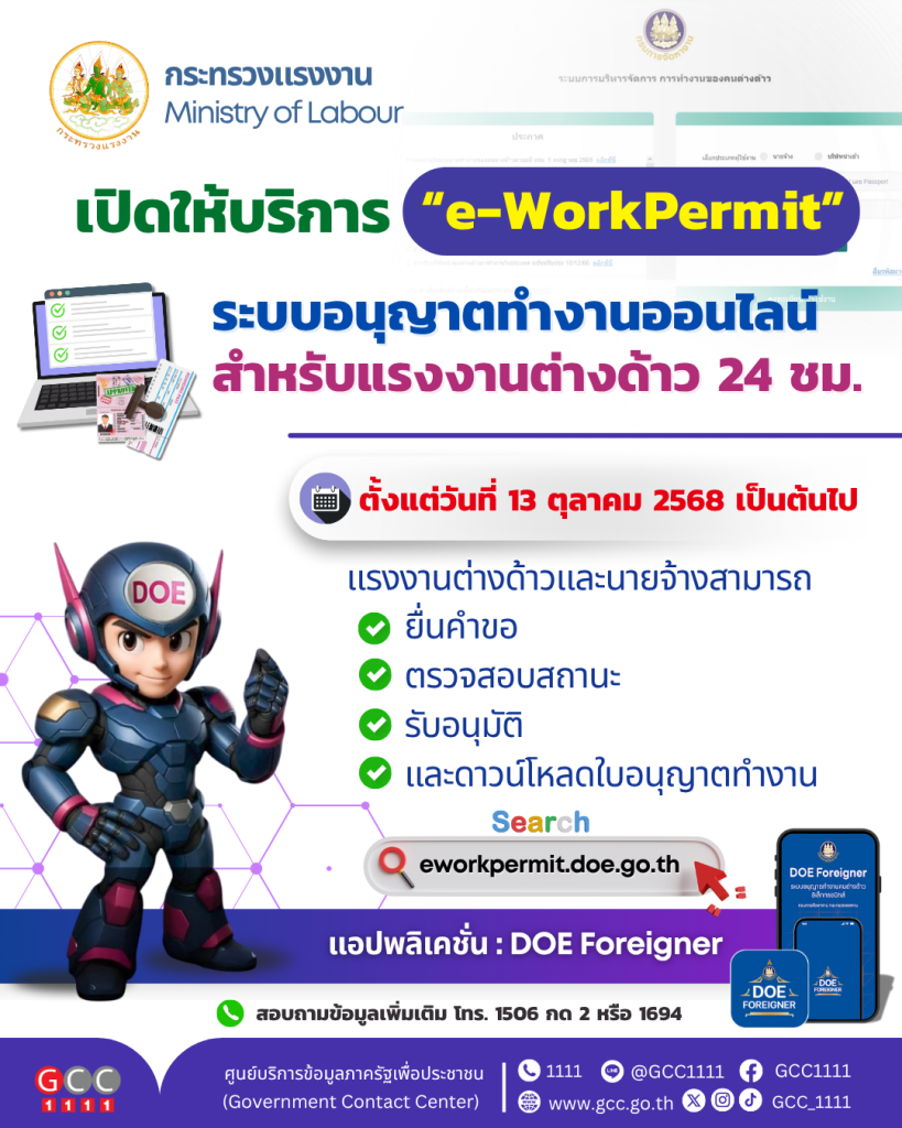 - โดยเปิดให้บริการทั่วประเทศ ตั้งแต่วันที่ 13 ตุลาคม 2568 ผ่านเว็บไซต์ eworkpermit.doe.go.th