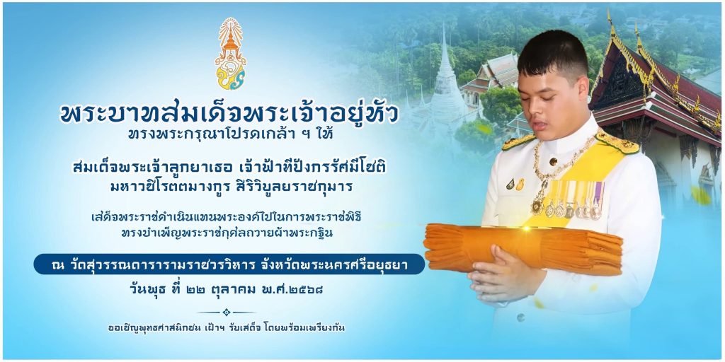 ขอเชิญประชาชนเฝ้าฯ รับเสด็จ สมเด็จพระเจ้าลูกยาเธอ เจ้าฟ้าทีปังกรรัศมีโชติ ฯ ในวันพุธที่ 22 ตุลาคม 2568 ข่าวสารกิจกรรม ขอเชิญประชาชนเฝ้าฯ รับเสด็จ สมเด็จพระเจ้าลูกยาเธอ เจ้าฟ้าทีปังกรรัศมีโชติ ฯ ในวันพุธที่ 22 ตุลาคม 2568 พระบาทสมเด็จพระเจ้าอยู่หัว ทรงพระกรุุณาโปรดเกล้าโปรดกระหม่อมให้ สมเด็จพระเจ้าลูกยาเธอ เจ้าฟ้าทีปังกรรัศมีโชติ มหาวชิโรตตมางกูร สิริวิบูลยราชกุมาร เสด็จพระราชดำเนินแทนพระองค์ไปในการพระราชพิธีทรงบำเพ็ญพระราชกุศลถวายผ้าพระกฐิน ณ วัดสุวรรณดาราราม ราชวรวิหาร อำเภอพระนครศรีอยุธยา จังหวัดพระนครศรีอยุธยา ในวันพุธที่ 22 ตุลาคม 2568 ขอเชิญพุทธศาสนิกชน และพสกนิกรชาวจังหวัดพระนครศรีอยุธยา เฝ้ารับเสด็จ โดยพร้อมเพรียงกัน ที่มา : facebook ถวายพระพรชัยมงคล Post Views: 21 FacebookFacebookXTwitterLINELine