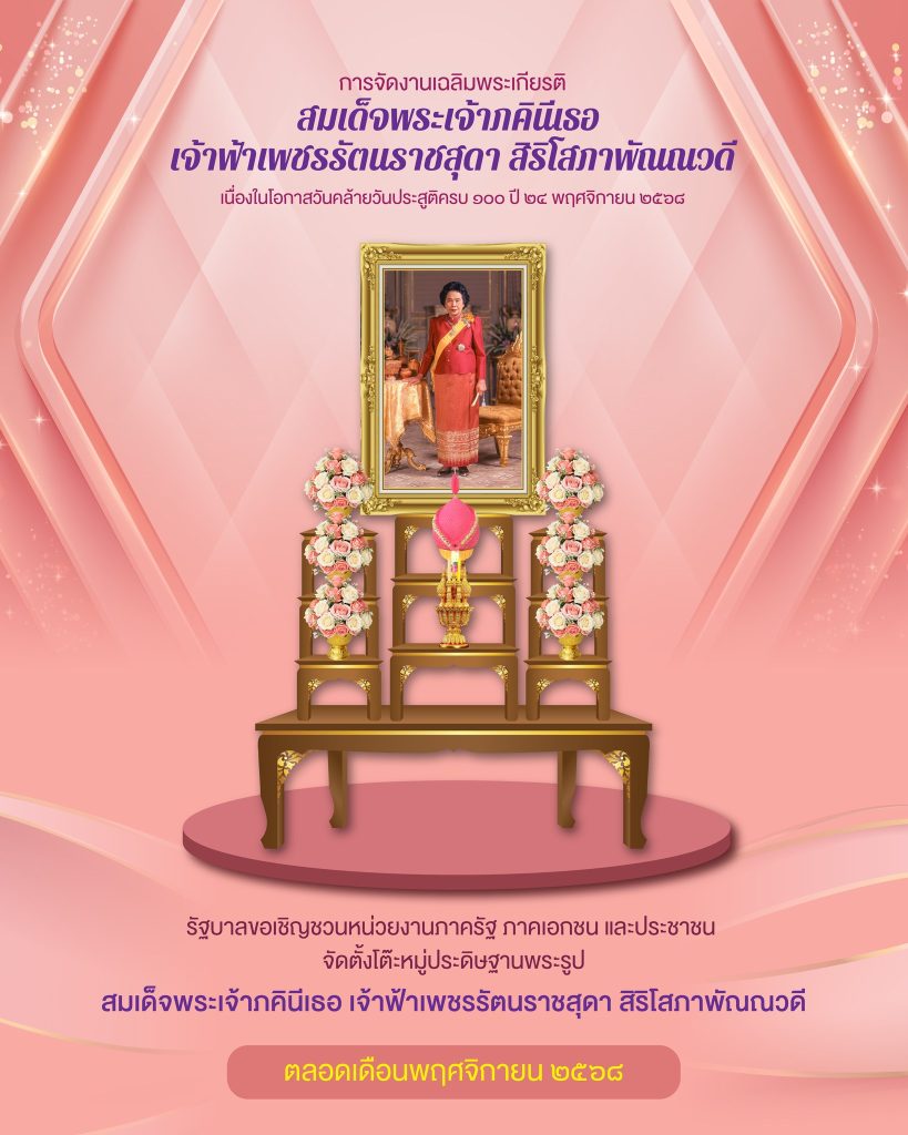 รัฐบาล ขอเชิญชวนจัดตั้งโต๊ะหมู่ประดิษฐานพระรูปสมเด็จพระเจ้าภคินีเธอ เจ้าฟ้าเพชรรัตนราชสุดาฯ ข่าวสารกิจกรรม รัฐบาล ขอเชิญชวนจัดตั้งโต๊ะหมู่ประดิษฐานพระรูปสมเด็จพระเจ้าภคินีเธอ เจ้าฟ้าเพชรรัตนราชสุดาฯ รัฐบาล ขอเชิญชวนหน่วยงานภาครัฐ ภาคเอกชน และประชาชน จัดตั้งโต๊ะหมู่ประดิษฐานพระรูปสมเด็จพระเจ้าภคินีเธอ เจ้าฟ้าเพชรรัตนราชสุดา สิริโสภาพัณณวดี เนื่องในโอกาสวันคล้ายวันประสูติครบ 100 ปี 24 พฤศจิกายน 2568 ตลอดเดือนพฤศจิกายน 2568สามารถดาวน์โหลดพระรูปได้ที่เว็บไซต์กรมประชาสัมพันธ์ https://drive.google.com/…/1OxbhjLOEFp6NBKtmZpOc1nY5bNz… ที่มา Facebook พระลาน Post Views: 16 FacebookFacebookXTwitterLINELine