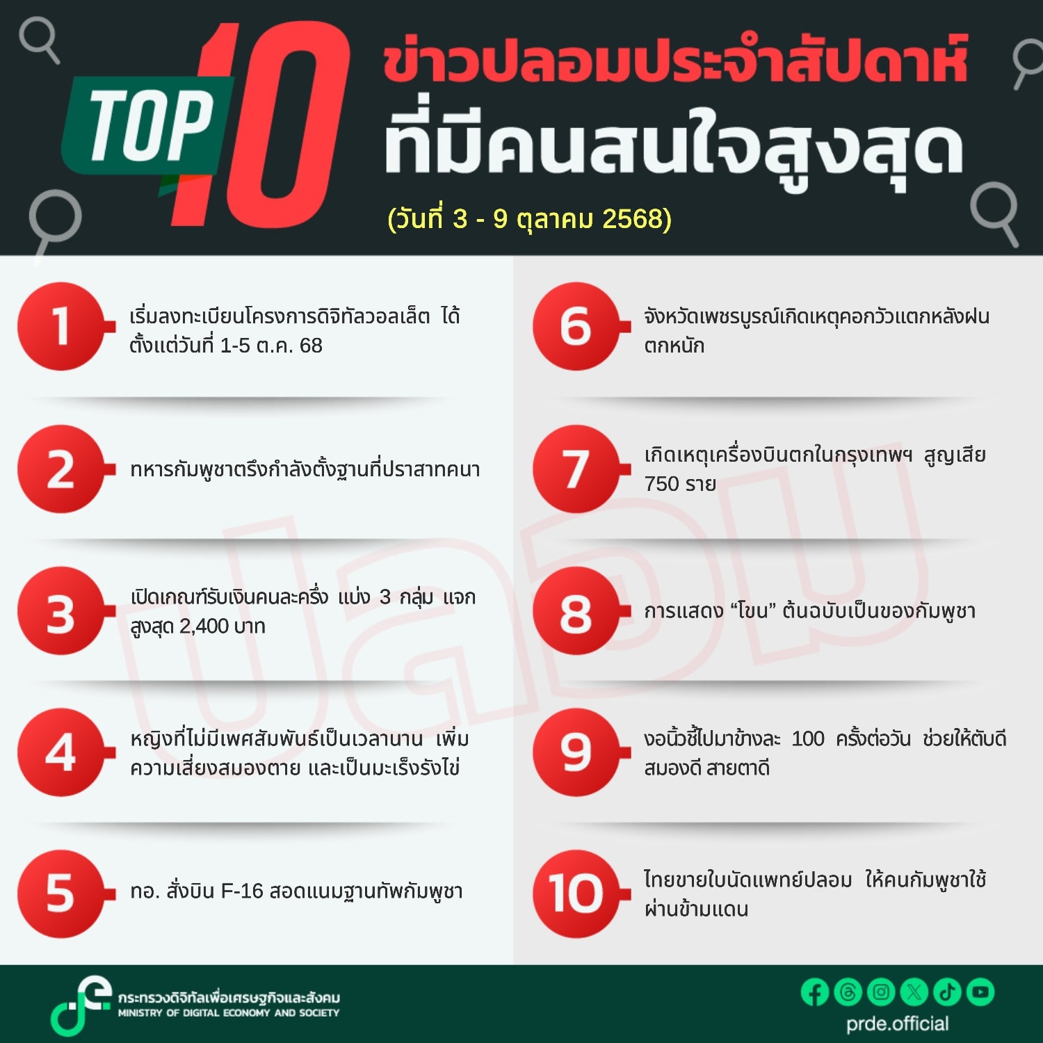 กระทรวงดิจิทัลเพื่อเศรษฐกิจและสังคม ตรวจพบข่าวปลอมรายสัปดาห์ ที่ประชาชนให้ความสนใจสูงสุดอันดับที่ 1 เรื่อง “เริ่มลงทะเบียนโครงการดิจิทัลวอลเล็ต ได้ตั้งแต่วันที่ 1-5 ต.ค. 68” รองลงมาคือเรื่อง “ทหารกัมพูชาตรึงกำลังตั้งฐานที่ปราสาทคนา” เตือนประชาชน อย่าหลงเชื่อข่าวปลอม อาจทำให้เกิดความเข้าใจผิด สับสน ตื่นตระหนก และวิตกกังวลในสังคม รวมทั้งอาจทำให้สูญเสียทรัพย์สิน และข้อมูลส่วนบุคคล โดยขอให้เลือกเชื่อ เลือกแชร์ ข้อมูลที่เป็นประโยชน์