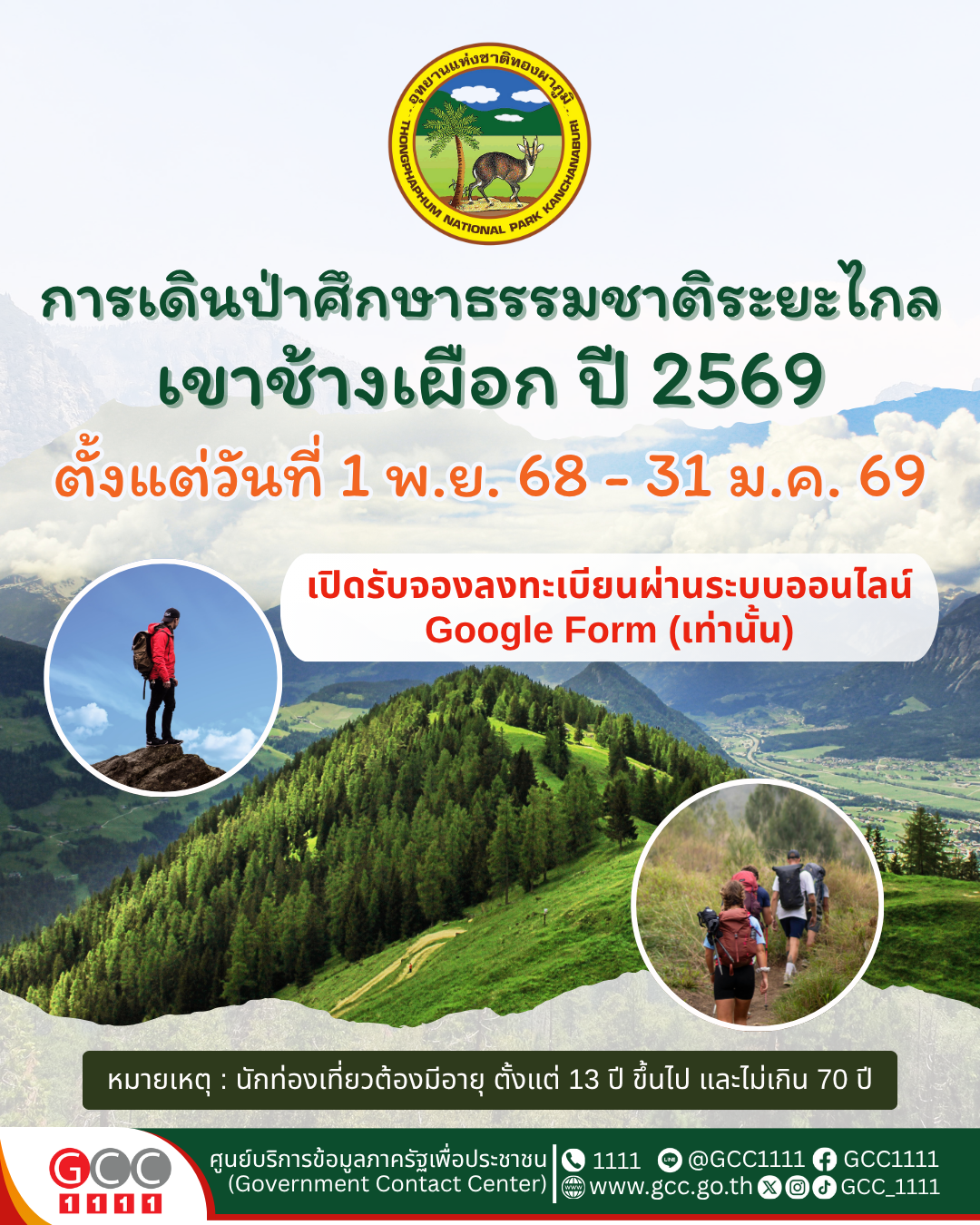 อุทยานแห่งชาติทองผาภูมิ แจ้งเปิดการท่องเที่ยวกิจกรรมการเดินป่าศึกษาธรรมชาติระยะไกลเขาช้างเผือก ประจำปีงบประมาณ พ.ศ. 2569 ตั้งแต่วันที่ 1 พฤศจิกายน 2568 ถึงวันที่ 31 มกราคม 2569
