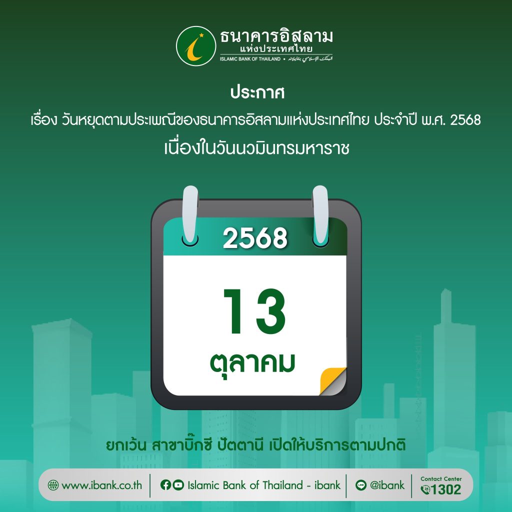 ธนาคารอิสลามแห่งประเทศไทย แจ้งประกาศวันหยุดตามประเพณีของธนาคารอิสลามแห่งประเทศไทย ประจำปี พ.ศ. 2568 เนื่องในวันนวมินทรมหาราช วันที่ 13 ตุลาคม 2568 ยกเว้น สาขาบิ๊กซี ปัตตานี เปิดให้บริการตามปกติ
