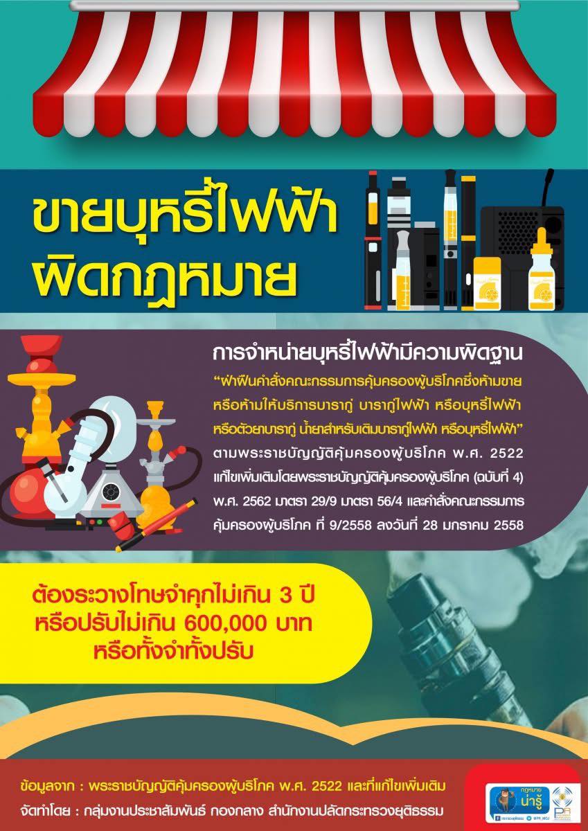 กระทรวงยุติธรรม แนะนำกฎหมายน่ารู้ “ขายบุหรี่ไฟฟ้า มีความผิดตามกฎหมาย” ซึ่งผู้จำหน่ายบุหรี่ไฟฟ้า บารากู่ไฟฟ้า หรือน้ำยาสำหรับเติม มีความผิดฐานฝ่าฝืนคำสั่งคณะกรรมการคุ้มครองผู้บริโภค ตามพระราชบัญญัติคุ้มครองผู้บริโภค พ.ศ. 2522 และที่แก้ไขเพิ่มเติม ต้องระวางโทษจำคุกไม่เกิน 3 ปี หรือปรับไม่เกิน 600,000 บาท หรือทั้งจำทั้งปรับ
