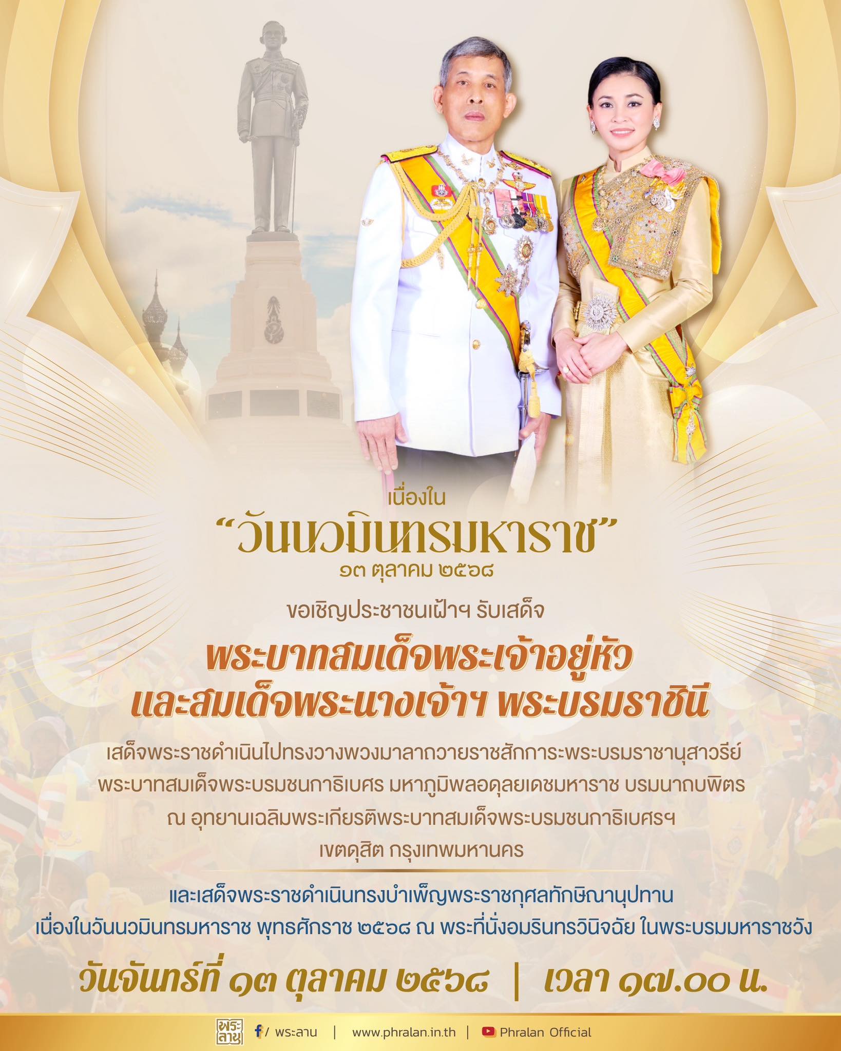 ขอเชิญชวนเฝ้าฯ รับเสด็จพระบาทสมเด็จพระเจ้าอยู่หัว และสมเด็จพระนางเจ้าฯ พระบรมราชินี วันที่ 13 ต.ค. 68 ข่าวสารกิจกรรม ขอเชิญชวนเฝ้าฯ รับเสด็จพระบาทสมเด็จพระเจ้าอยู่หัว และสมเด็จพระนางเจ้าฯ พระบรมราชินี วันที่ 13 ต.ค. 68 ขอเชิญชวนเฝ้าฯ รับเสด็จพระบาทสมเด็จพระเจ้าอยู่หัว และสมเด็จพระนางเจ้าฯ พระบรมราชินี ในวันจันทร์ที่ 13 ตุลาคม 2568 เวลา 17.00 น. ณ อุทยานเฉลิมพระเกียรติพระบาทสมเด็จพระบรมชนกาธิเบศร มหาภูมิพลอดุลยเดชมหาราช บรมนาถบพิตร เขตดุสิต กรุงเทพฯ ขอเชิญประชาชนร่วมน้อมรำลึกในพระมหากรุณาธิคุณ พระบาทสมเด็จพระบรมชนกาธิเบศร มหาภูมิพลอดุลยเดชมหาราช บรมนาถบพิตร เนื่องในวันนวมินทรมหาราช พุทธศักราช 2568 พร้อมเฝ้าฯ รับเสด็จพระบาทสมเด็จพระเจ้าอยู่หัว และสมเด็จพระนางเจ้าฯ พระบรมราชินี เสด็จพระราชดำเนินไปทรงวางพวงมาลา ณ พระบรมราชานุสาวรีย์พระบาทสมเด็จพระบรมชนกาธิเบศร มหาภูมิพลอดุลยเดชมหาราช บรมนาถบพิตร วันจันทร์ที่ 13 ตุลาคม 2568 เวลา 17.00 น. ณ อุทยานเฉลิมพระเกียรติพระบาทสมเด็จพระบรมชนกาธิเบศร มหาภูมิพลอดุลยเดชมหาราช บรมนาถบพิตร เขตดุสิต กรุงเทพฯ ที่มา : Facebook พระลาน Post Views: 44 FacebookFacebookXTwitterLINELine