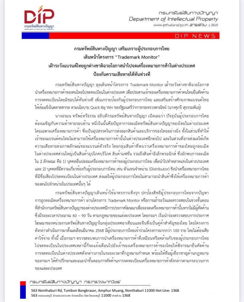 กรมทรัพย์สินทางปัญญาเดินหน้าใช้มาตรการเชิงรุก ปกป้องสิทธิผู้ประกอบการไทยจากปัญหาการถูกละเมิดเครื่องหมายการค้า ผ่านโครงการ Trademark Monitor หรือการเฝ้าระวังและตรวจสอบในช่วงขั้นตอนที่สำนักงานทรัพย์สินทางปัญญาของต่างประเทศมีการประกาศโฆษณาเพื่อจะจดเครื่องหมายการค้านั้นหากไม่มีผู้คัดค้าน ซึ่งมีระยะเวลาประมาณ 60 – 90 วัน ตามกฎหมายของแต่ละประเทศ