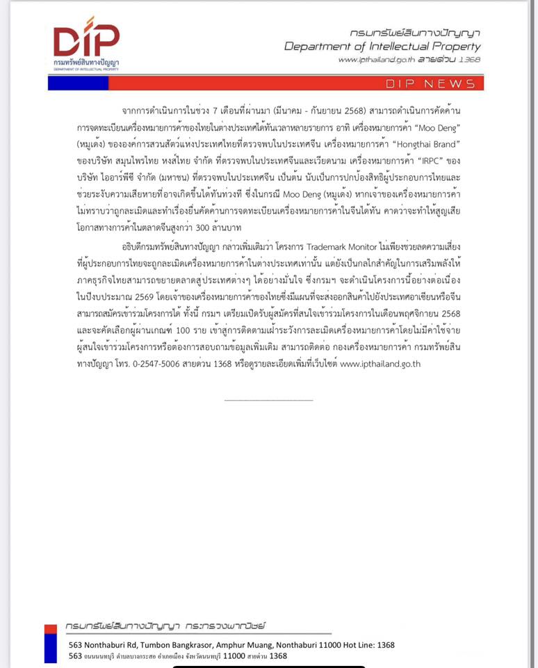 จากการดำเนินการในช่วง 7 เดือนที่ผ่านมา (มีนาคม – กันยายน 2568) สามารถดำเนินการคัดค้านการจดทะเบียนเครื่องหมายการค้าของไทยในต่างประเทศได้ทันเวลาหลายรายการ อาทิ เครื่องหมายการค้า “Moo Deng” (หมูเด้ง) ขององค์การสวนสัตว์แห่งประเทศไทยที่ตรวจพบในประเทศจีน เครื่องหมายการค้า “Hongthai Brand” ของบริษัท สมุนไพรไทย หงส์ไทย จำกัด ที่ตรวจพบในประเทศจีนและเวียดนาม เครื่องหมายการค้า “IRPC” ของบริษัท ไออาร์พีซี จำกัด (มหาชน) ที่ตรวจพบในประเทศจีน เป็นต้น