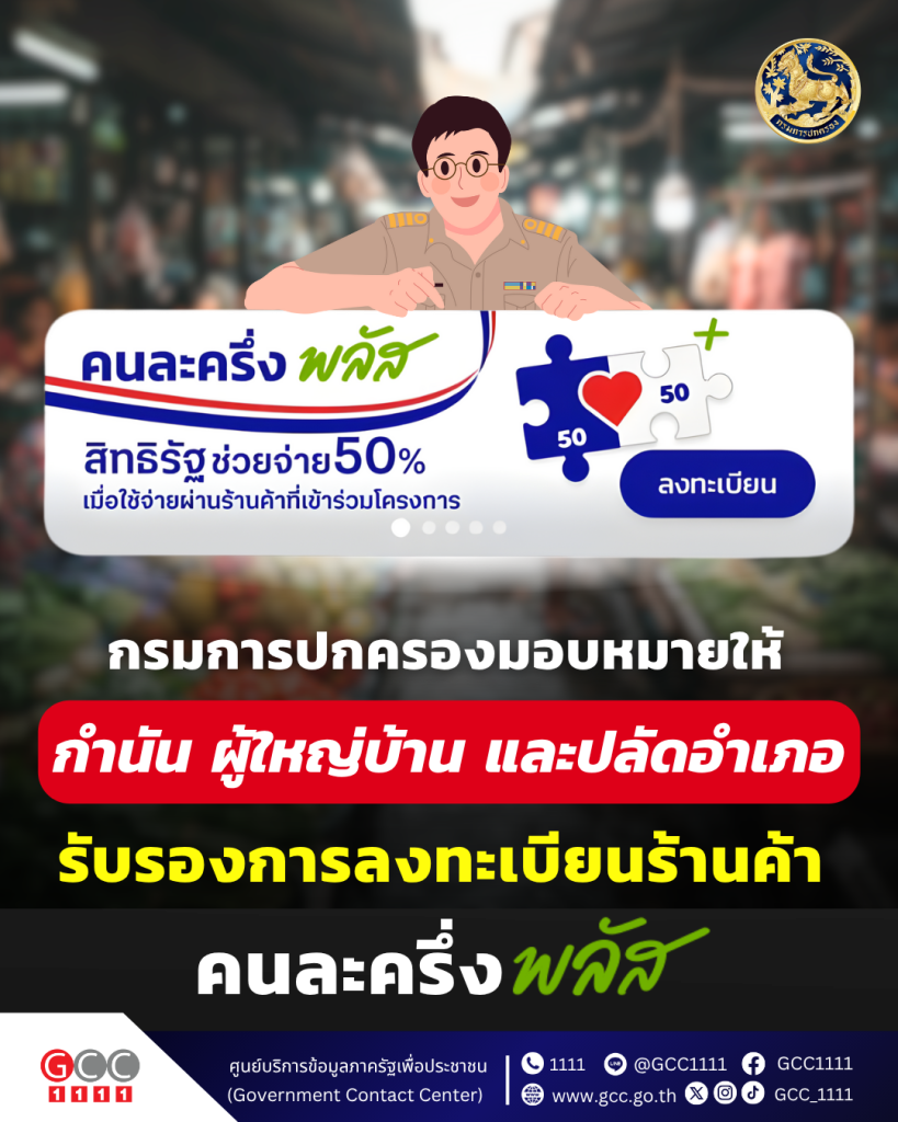 กรมการปกครอง มอบหมายให้ กำนัน ผู้ใหญ่บ้าน และปลัดอำเภอ ในพื้นที่ที่ร้านค้าตั้งอยู่ ทำหน้าที่ รับรองการลงทะเบียนร้านค้า ที่สมัครเข้าร่วมโครงการ “คนละครึ่ง พลัส” เพื่อให้การดำเนินงานเป็นไปด้วยความเรียบร้อย โปร่งใส และทั่วถึง