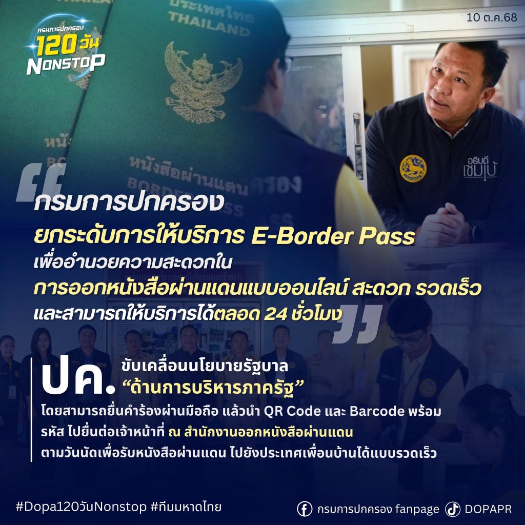 กรมการปกครอง ยกระดับการให้บริการประชาชนด้วยระบบ E-Border Pass เพื่ออำนวยความสะดวกในการยื่นคำร้องขอหนังสือผ่านแดนแบบออนไลน์ สามารถดำเนินการได้ผ่านโทรศัพท์มือถือทุกที่ทุกเวลา พร้อมให้บริการตลอด 24 ชั่วโมง
