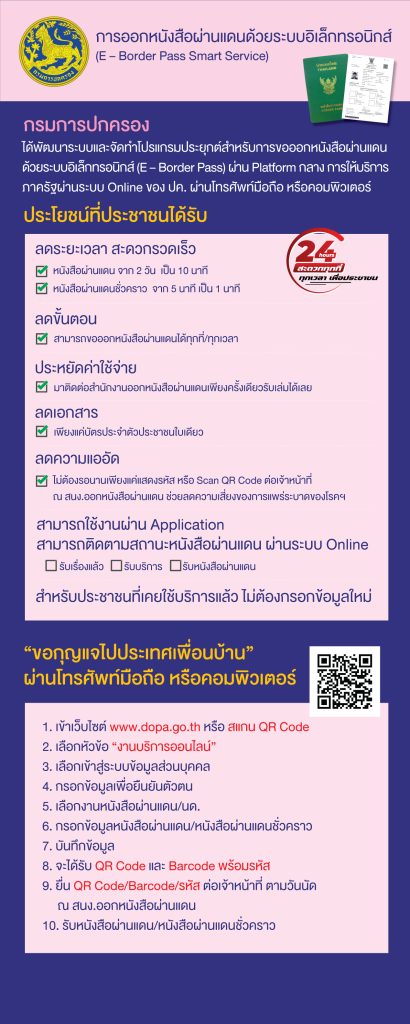 ระบบดังกล่าวเปิดโอกาสให้ประชาชน ยื่นคำร้องผ่านโทรศัพท์มือถือได้ทุกที่ทุกเวลา ผ่านเว็บไซต์ www.dopa.go.th หรือ สแกน QR Code โดยเมื่อกรอกข้อมูลและชำระค่าธรรมเนียมเรียบร้อยแล้ว ระบบจะออก QR Code และ Barcode พร้อมรหัสยืนยัน เพื่อใช้ยื่นต่อเจ้าหน้าที่ ณ สำนักงานออกหนังสือผ่านแดน ตามวันที่นัดหมาย เพื่อรับหนังสือผ่านแดนไปยังประเทศเพื่อนบ้านได้อย่างรวดเร็วและมีประสิทธิภาพ