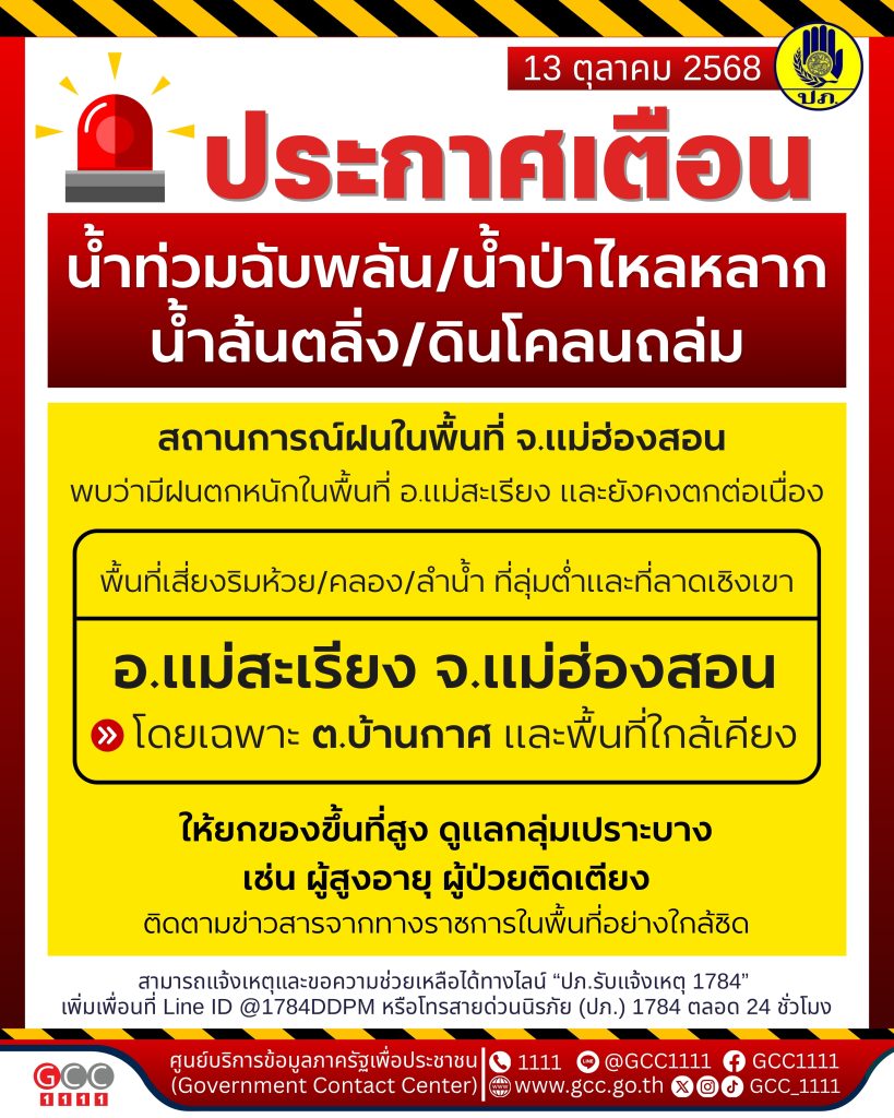 กรมป้องกันและบรรเทาสาธารณภัย (ปภ.) และจังหวัดแม่ฮ่องสอน ได้ติดตามสถานการณ์ฝนในพื้นที่ จ.แม่ฮ่องสอน พบว่ามีฝนตกหนักในพื้นที่ อ.แม่สะเรียง และยังคงตกต่อเนื่อง ขอให้เฝ้าระวังน้ำท่วมฉับพลัน น้ำป่าไหลหลาก น้ำล้นตลิ่ง ดินโคลนถล่ม ในพื้นที่เสี่ยงริมห้วย/คลอง/ลำน้ำ ที่ลุ่มต่ำและที่ลาดเชิงเขา โดยเฉพาะ ต.บ้านกาศ และพื้นที่ใกล้เคียง ให้ยกของขึ้นที่สูง ดูแลกลุ่มเปราะบาง เช่น ผู้สูงอายุ ผู้ป่วยติดเตียง และติดตามข่าวสารจากทางราชการในพื้นที่อย่างใกล้ชิด