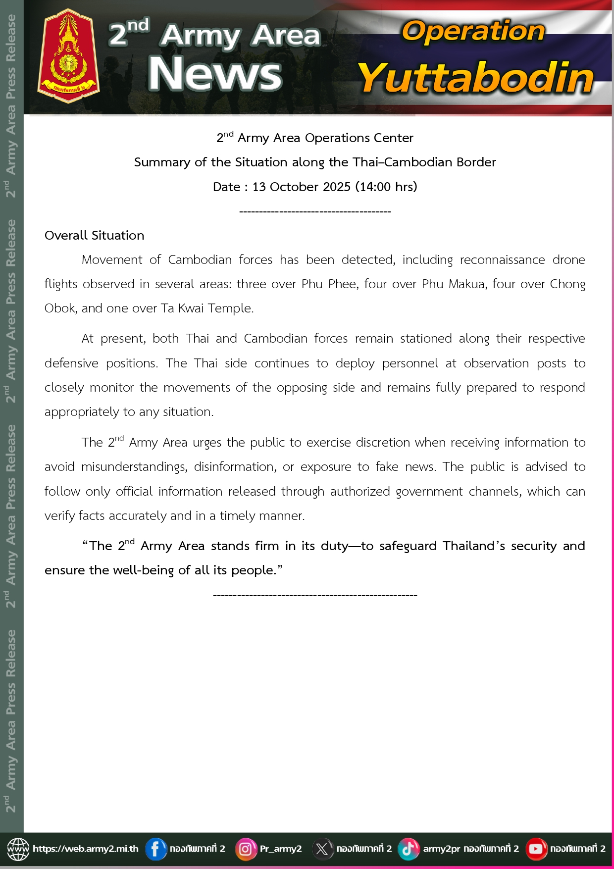 “The 2nd Army Area stands firm in its duty—to safeguard Thailand’s security and ensure the well-being of all its people.”