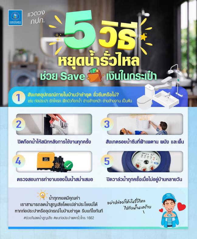การประปาส่วนภูมิภาค แนะนำ 5 วิธีหยุดน้ำรั่วไหล