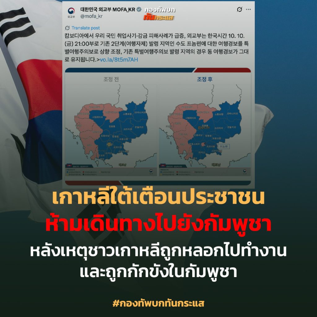 เกาหลีใต้ ประกาศเตือนประชาชนห้ามเดินทางไปยังกัมพูชา หลังเหตุชาวเกาหลีถูกหลอกไปทำงานและถูกกักขัง ข่าวสารกิจกรรม เกาหลีใต้ ประกาศเตือนประชาชนห้ามเดินทางไปยังกัมพูชา หลังเหตุชาวเกาหลีถูกหลอกไปทำงานและถูกกักขัง เกาหลีใต้ ประกาศเตือนประชาชนไม่ให้เดินทางไปกรุงพนมเปญ ประเทศกัมพูชา หลังมีชาวเกาหลีหลายคนถูกหลอกไปทำงานและถูกกักขังไว้ในพื้นที่ดังกล่าว คำเตือนนี้ถือเป็น “ระดับพิเศษ” ซึ่งหมายความว่าควรงดเดินทางไปโดยเด็ดขาด นอกจากนี้ยังมีหลายจังหวัดของกัมพูชาที่อยู่ในระดับเตือนสูงสุด เช่น สีหนุวิลล์ เกาะกง และพระตะบอง ทั้งนี้ ขอให้ผู้ที่อยู่ในกัมพูชาเพิ่มความระมัดระวัง และจะติดตามสถานการณ์อย่างใกล้ชิดเพื่อปรับคำเตือนอีกครั้งหากจำเป็น ที่มา : Facebook กองทัพบก ทันกระแส Post Views: 58 FacebookFacebookXTwitterLINELine