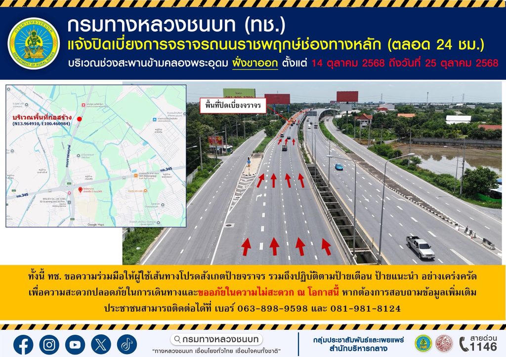 กรมทางหลวงชนบท แจ้งปิดเบี่ยงจราจรชั่วคราวบนถนนราชพฤกษ์ช่องทางหลัก บริเวณช่วงสะพานข้ามคลองพระอุดม ฝั่งขาออก วันที่ 14 – 25 ตุลาคม 2568 โดยจะทำการปิดเบี่ยงการจราจรตลอด 24 ชั่วโมง