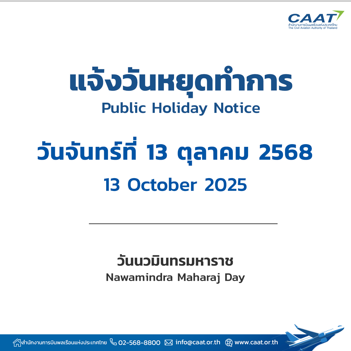 สำนักงานการบินพลเรือนแห่งประเทศไทย แจ้งปิดทำการวันที่ 13 ตุลาคม 2568 เนื่องในวันนวมินทรมหาราช