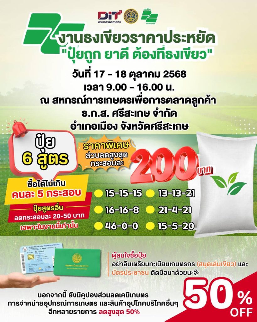 กรมการค้าภายใน จัดงานธงเขียวราคาประหยัด “ปุ๋ยถูก ยาดี ต้องที่ธงเขียว” วันที่ 17 – 18 ตุลาคม 2568 เวลา 9.00 – 16.00 น. ณ สหกรณ์การเกษตรเพื่อการตลาดลูกค้า ธ.ก.ส. ศรีสะเกษ จำกัด อำเภอเมือง จังหวัดศรีสะเกษ สำหรับผู้สนใจซื้อปุ๋ย กรุณาเตรียมทะเบียนเกษตรกร (สมุดเล่มเขียว) และ บัตรประชาชน มาด้วย ภายในงาน มีคูปองส่วนลดเคมีเกษตร การจําหน่ายอุปกรณ์การเกษตร และสินค้าอุปโภคบริโภคอื่นๆ อีกหลายรายการ ลดสูงสุด 50%
