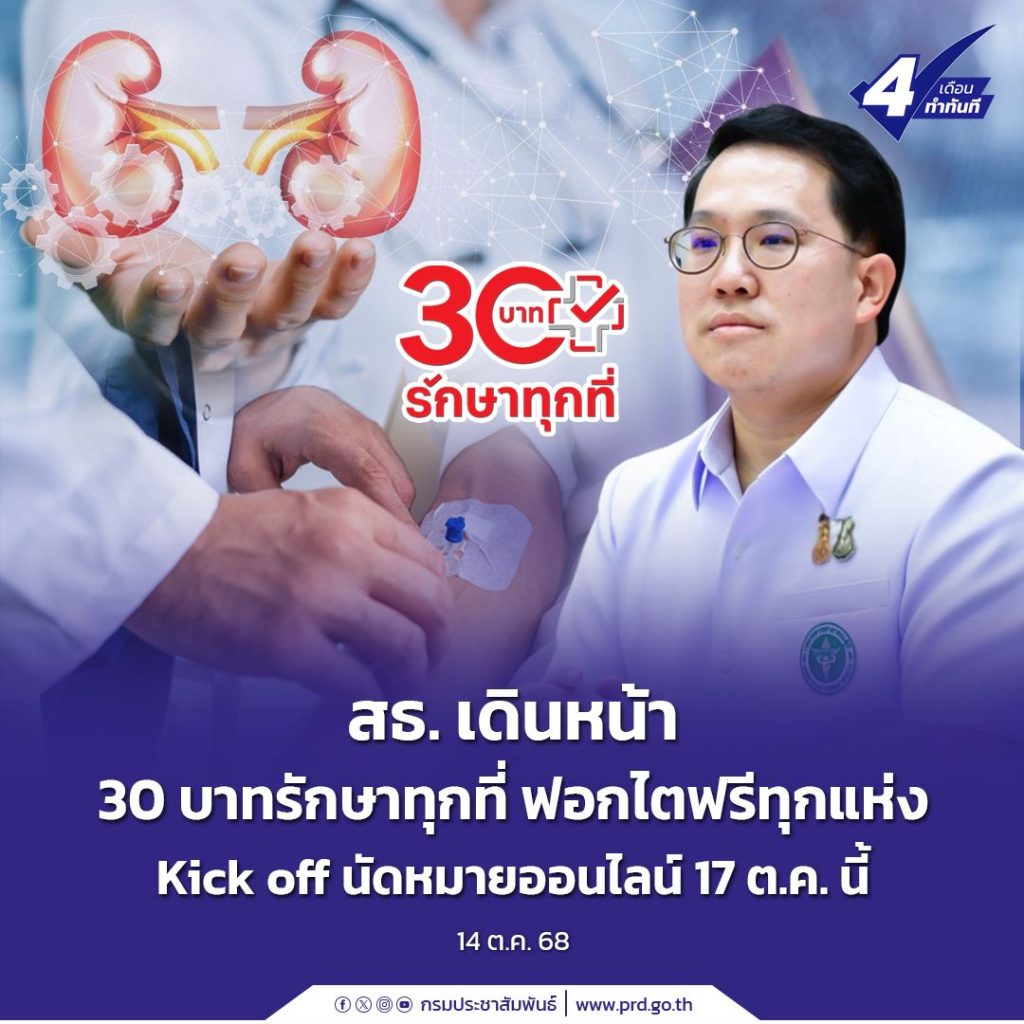 สธ. เดินหน้า “30 บาทรักษาทุกที่ ฟอกไตฟรีทุกแห่ง” เริ่มนัดหมายออนไลน์ วันที่ 17 ต.ค. 68