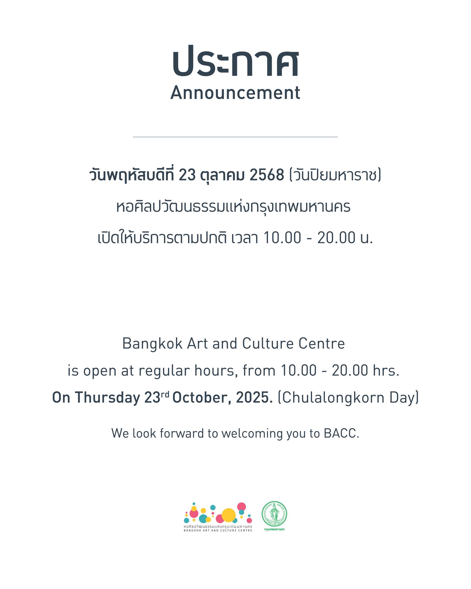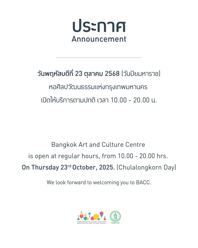 หอศิลปกรุงเทพฯ เปิดให้บริการตามปกติ ในวันที่ 23 ตุลาคม 2568 เนื่องในวันปิยมหาราช ข่าวสารกิจกรรม หอศิลปกรุงเทพฯ เปิดให้บริการตามปกติ ในวันที่ 23 ตุลาคม 2568 เนื่องในวันปิยมหาราช หอศิลปกรุงเทพฯ เปิดให้บริการตามปกติ ในวันที่ 23 ตุลาคม 2568 เนื่องในวันปิยมหาราชตั้งแต่เวลา 10.00 – 20.00 น. ที่มา : Facebook Bacc หอศิลปวัฒนธรรมแห่งกรุงเทพมหานคร Post Views: 4 FacebookFacebookXTwitterLINELine