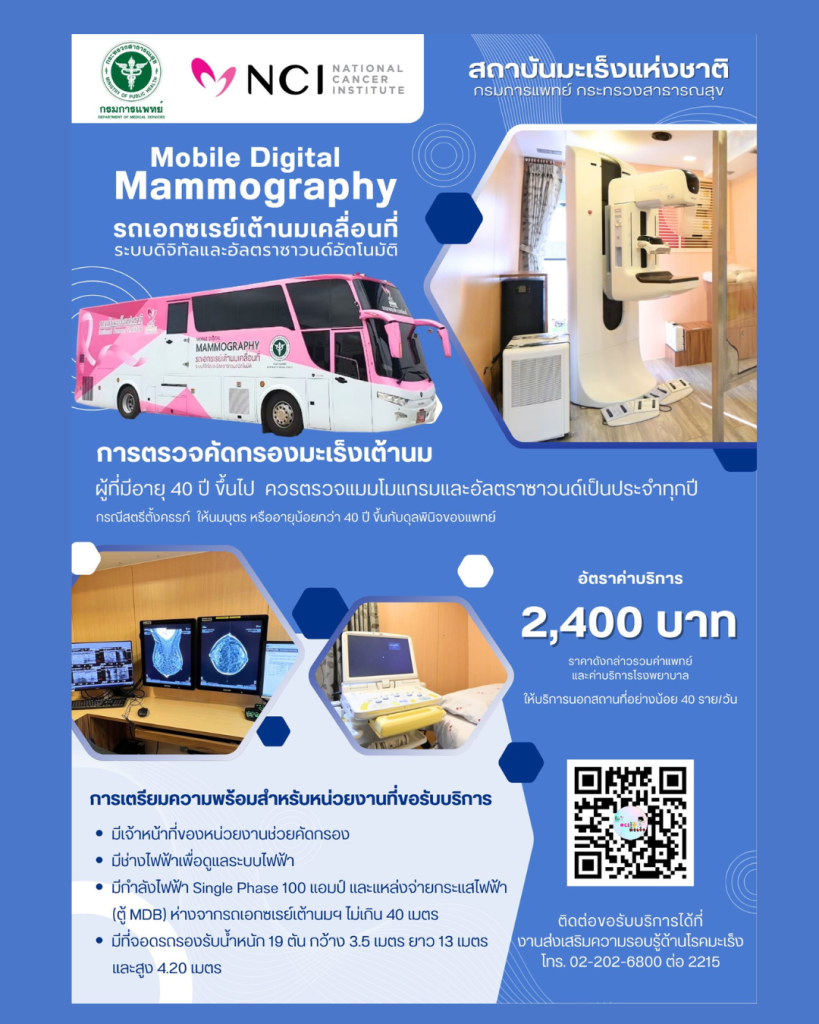 สถาบันมะเร็งแห่งชาติ บริการตรวจคัดกรองมะเร็งเต้านมนอกสถานที่ด้วย Mobile Digital Mammography รถเอกซเรย์เต้านมเคลื่อนที่ ระบบดิจิทัลและอัลตราซาวนด์อัตโนมัติ เพื่อเพิ่มความสะดวกในการเข้าถึงการรับบริการแก่สตรีที่มีความเสี่ยงเป็นมะเร็งเต้านม สามารถตรวจพบได้ตั้งแต่ระยะเริ่มแรก ช่วยทำให้การรักษาได้ผลดี หรือหายขาดได้ และเพิ่มอัตราการรอดชีวิต และสะดวก แม่นยำ รวดเร็ว ทราบผลในวันรับบริการ