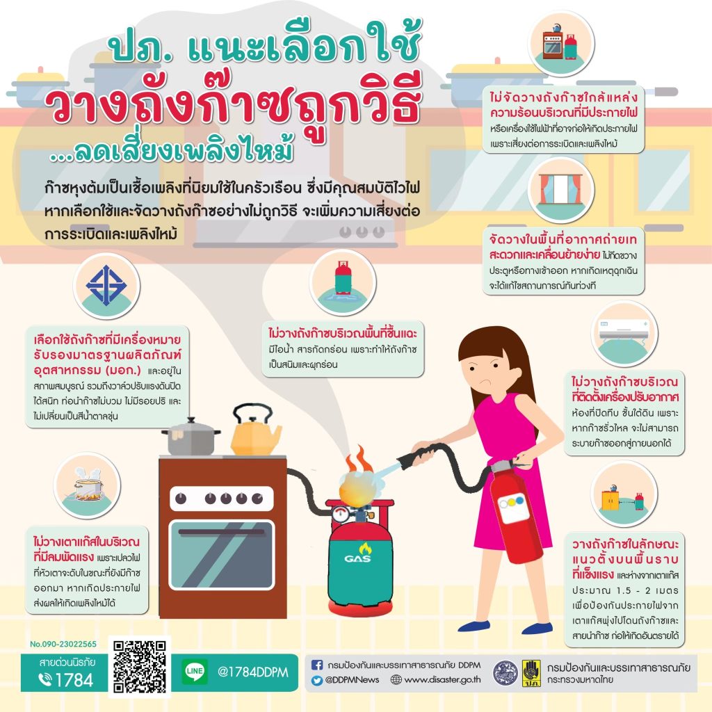 กรมป้องกันและบรรเทาสาธารณภัย (ปภ.) ขอแนะข้อควรปฏิบัติในการใช้ก๊าซหุงต้มอย่างถูกวิธีและปลอดภัย โดยเลือกใช้ถังก๊าซที่ได้มาตรฐาน มอก. และอยู่ในสภาพสมบูรณ์ วางถังก๊าซในบริเวณที่แข็งแรง มีอากาศถ่ายเทสะดวก และปิดวาล์วถังก๊าซทุกครั้งหลังใช้งาน หากสงสัยว่าก๊าซรั่ว ให้รีบปิดวาล์วถังก๊าซและเตาแก๊สทันที ห้ามจุดไฟ สูบบุหรี่ หรือเปิด – ปิดสวิตช์ไฟทุกชนิด เพราะอาจทำให้เกิดประกายไฟ และเกิดการระเบิดได้