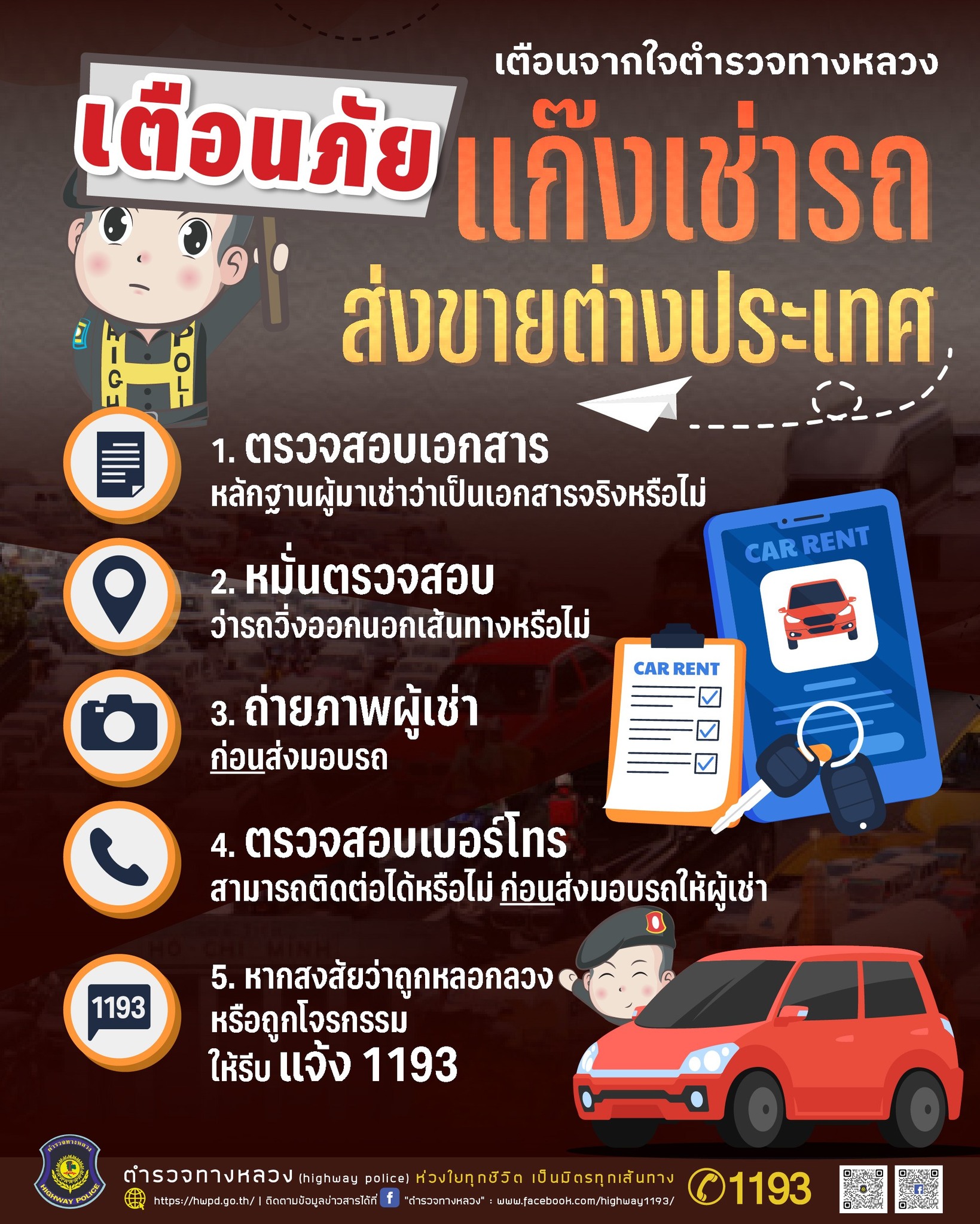 ตำรวจทางหลวง แจ้งเตือนภัยแก๊งเช่ารถส่งขายต่างประเทศ แนะนำก่อนปล่อยรถให้เช่าตรวจสอบเอกสาร หลักฐานผู้มาเช่าว่าเป็นเอกสารจริงหรือไม่ หมั่นตรวจสอบ ว่ารถวิ่งออกนอกเส้นทางหรือไม่ ถ่ายภาพผู้เช่า ก่อนส่งมอบรถ ตรวจสอบเบอร์โทร สามารถติดต่อได้หรือไม่ ก่อนส่งมอบรถให้ผู้เช่า และหากสงสัยว่าถูกหลอกลวง หรือถูกโจรกรรม ให้รีบแจ้ง 1193