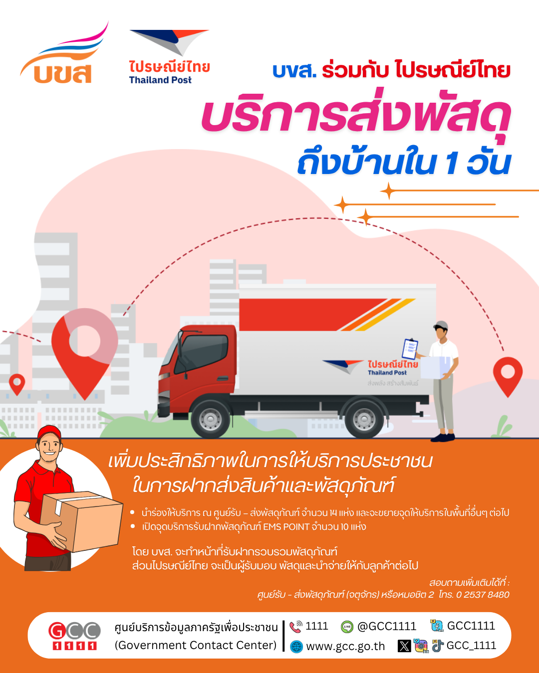 บริษัท ขนส่ง จำกัด ร่วมกับ บริษัท ไปรษณีย์ไทย จำกัด บริการส่งพัสดุถึงบ้านใน 1 วัน เพิ่มประสิทธิภาพในการให้บริการประชาชนในการฝากส่งสินค้าและพัสดุภัณฑ์ ได้นำร่องให้บริการ ณ ศูนย์รับ – ส่งพัสดุภัณฑ์ จำนวน 14 แห่ง และจะขยายจุดให้บริการในพื้นที่อื่นๆ ต่อไป และยังได้เปิดจุดบริการรับฝากพัสดุภัณฑ์ EMS Point จำนวน 10 แห่ง ซึ่ง บขส. จะทำหน้าที่รับฝากรวบรวมพัสดุภัณฑ์ ส่วนไปรษณีย์ไทย จะเป็นผู้รับมอบ พัสดุและนำจ่ายให้กับลูกค้าต่อไป สอบถามรายละเอียดเพิ่มเติมได้ที่ ศูนย์รับ – ส่งพัสดุภัณฑ์ (จตุจักร) หรือหมอชิต 2 โทร. 02 – 537 – 8480