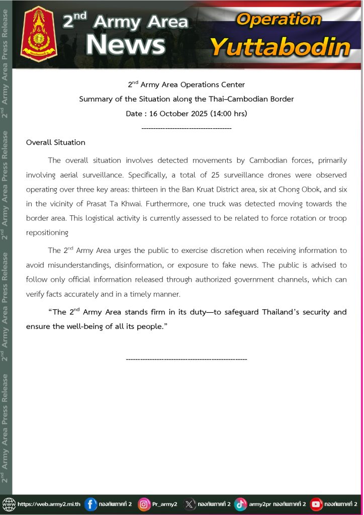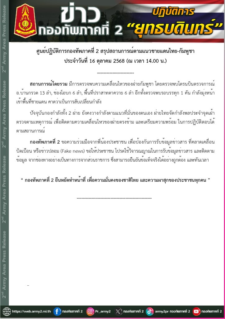 กองทัพภาคที่ 2 สรุปสถานการณ์ตามแนวชายแดนไทย – กัมพูชา ประจำวันที่ 16 ตุลาคม 2568 (เวลา 14.00 น.)