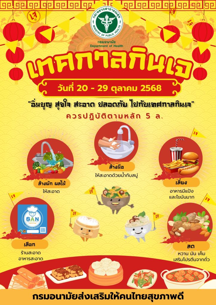 กรมอนามัย แนะนำหลัก 5 ล. ในช่วงเทศกาลกินเจ 2568 ข่าวสารกิจกรรม กรมอนามัย แนะนำหลัก 5 ล. ในช่วงเทศกาลกินเจ 2568 เทศกาลกินเจ ในปีนี้ ตรงกับวันที่ 20 – 29 ตุลาคม 2568“อิ่มบุญ สุขใจ สะอาด ปลอดภัย ไปกับเทศกาลกินเจ”ด้วยหลัก 5 ล. ดังนี้ล. เลือก ร้านสะอาด อาหารสะอาดล. ล้างผัก ผลไม้ ให้สะอาดล. ล้างมือ ให้สะอาดด้วยน้ำกับสบู่ล. เลี่ยง อาหารมีแป้งและไขมันมากล. ลด หวาน มัน เค็ม เสริมโปรตีนจากถั่ว ที่มา : Facebook สำนักสุขาภิบาลอาหารและน้ำ กรมอนามัย Post Views: 23 FacebookFacebookXTwitterLINELine