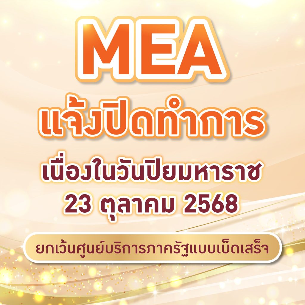 โดยที่ทำการ MEA อื่น ๆ จะเปิดทำการและให้บริการตามปกติ ในวันศุกร์ที่ 24 ตุลาคม 2568 ระหว่างเวลา 07.30 – 15.30 น.