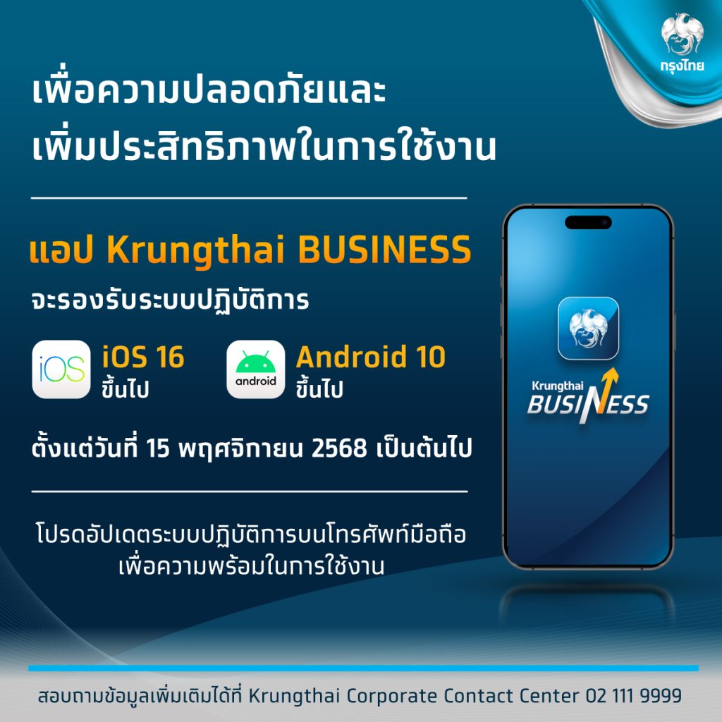 ธนาคารกรุงไทย แจ้ง แอป Krungthai BUSINESS จะรองรับ iOS 16 และ Android 10 ขึ้นไป เริ่ม 15 พ.ย. 68