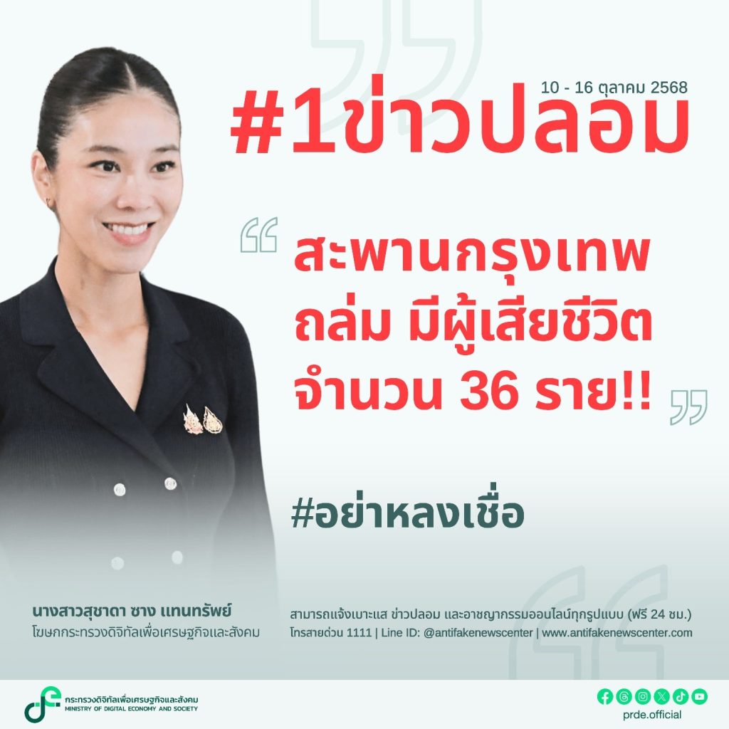 กระทรวงดิจิทัลเพื่อเศรษฐกิจและสังคม เตือนข่าวปลอม “สะพานกรุงเทพถล่ม มีผู้เสียชีวิต 36 ราย” สร้างความตื่นตระหนก วิตกกังวลในสังคม