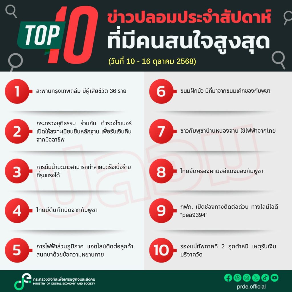 กระทรวงดิจิทัลเพื่อเศรษฐกิจและสังคม (ดีอี) ตรวจพบข่าวปลอมรายสัปดาห์ ที่ประชาชนให้ความสนใจสูงสุดอันดับที่ 1 เรื่อง “สะพานกรุงเทพถล่ม มีผู้เสียชีวิต 36 ราย” รองลงมาคือเรื่อง “กระทรวงยุติธรรม ร่วมกับ ตำรวจไซเบอร์ เปิดให้ลงทะเบียนยื่นหลักฐาน เพื่อรับเงินคืนจากมิจฉาชีพ” เตือนประชาชน อย่าหลงเชื่อข่าวปลอม อาจทำให้เกิดความเข้าใจผิด สับสน ตื่นตระหนก และวิตกกังวลในสังคม รวมทั้งอาจทำให้สูญเสียทรัพย์สิน และข้อมูลส่วนบุคคล ขอให้เลือกเชื่อ เลือกแชร์ ข้อมูลที่เป็นประโยชน์