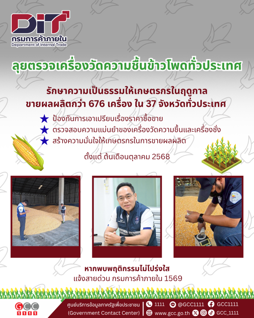 อธิบดีกรมการค้าภายใน กล่าวเพิ่มเติมว่า การตรวจสอบเครื่องวัดความชื้นข้าวโพดเป็นมาตรการสำคัญในการคุ้มครองเกษตรกร เพราะค่าความชื้นมีผลโดยตรงต่อราคารับซื้อ หากเครื่องวัดความชื้นไม่ได้มาตรฐาน อาจทำให้เกษตรกรได้รับราคาที่ต่ำกว่าความเป็นจริง กรมฯ จึงขอให้ผู้ประกอบการให้ความร่วมมือใช้เครื่องวัดความชื้นที่ผ่านการรับรองจากกรมการค้าภายใน และให้เกษตรกรสังเกตเครื่องวัดความชื้นที่มีเครื่องหมายคำรับรองของกรมฯ เพื่อสร้างความมั่นใจในการซื้อขาย โดยหากพบว่า มีการกดราคารับซื้อต่ำกว่าราคาตลาด การติดป้ายแสดงราคารับซื้อไม่ชัดเจน หรือสงสัยผู้ประกอบการใช้เครื่องชั่งน้ำหนักและเครื่องวัดความชื้นไม่ได้มาตรฐาน แจ้งได้ที่สายด่วนกรมการค้าภายใน 1569 ศูนย์หรือสำนักงานสาขาชั่งตวงวัด และสำนักงานพาณิชย์จังหวัดทั่วประเทศ