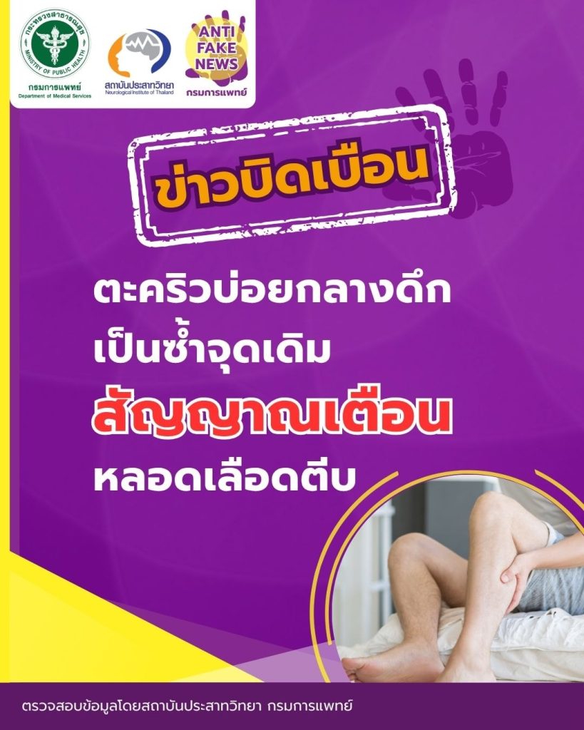 กรมการแพทย์ เปิดเผย เป็นตะคริวบ่อยกลางดึก เป็นซ้ำจุดเดิม สัญญาณเตือนหลอดเลือดตีบ เป็นข่าวบิดเบือน อาการตะคริวที่เกิดบ่อยและซ้ำที่จุดเดิม เช่น น่อง ขา หรือฝ่าเท้า อาจเกิดจากหลายสาเหตุ ไม่ใช่แค่หลอดเลือดตีบ เช่น กล้ามเนื้อใช้งานหนักเกินไป, ขาดน้ำ, ขาดวิตามินหรือแร่ธาตุ, ไทรอยด์ทำงานต่ำ หรือโรคทางระบบประสาทและกล้ามเนื้อ ดังนั้น หากมีอาการบ่อยหรือรุนแรง ควรพบแพทย์เพื่อตรวจหาสาเหตุที่แท้จริง ตรวจสอบโดย สถาบันประสาทวิทยา กรมการแพทย์ กระทรวงสาธารณสุข