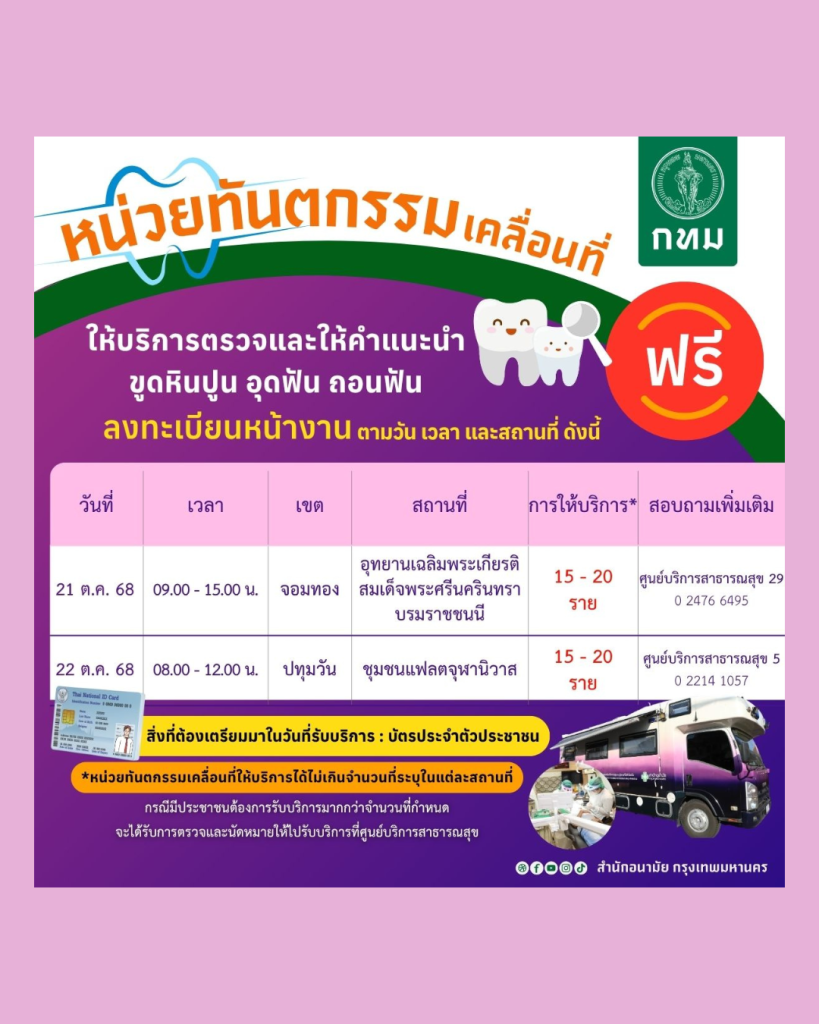 สำนักอนามัย กรุงเทพมหานคร จัดหน่วยทันตกรรมเคลื่อนที่ ฟรี วันที่ 21 – 22 ตุลาคม 2568 ข่าวสารกิจกรรม สำนักอนามัย กรุงเทพมหานคร จัดหน่วยทันตกรรมเคลื่อนที่ ฟรี วันที่ 21 – 22 ตุลาคม 2568 สำนักอนามัย กรุงเทพมหานคร จัดหน่วยทันตกรรมเคลื่อนที่ให้บริการตรวจ และให้คำแนะนำขูดหินปูน อุดฟัน ถอนฟัน ฟรี วันที่ 21 ตุลาคม 2568 เวลา 09.00-15.00 น. เขตจอมทอง ณ อุทยานเฉลิมพระเกียรติ สมเด็จพระศรีนครินทรา บรมราชชนนี และวันที่ 22 ตุลาคม 2568 เวลา 08.00-12.00 น. เขตปทุมวัน ณ ชุมชนแฟลตจุฬานิวาส สิ่งที่ต้องเตรียมมาในวันที่รับบริการบัตรประจำตัวประชาชนหมายเหตุหน่วยทันตกรรมเคลื่อนที่ให้บริการได้ไม่เกินจำนวนที่ระบุในแต่ละสถานที่กรณีมีประชาชนต้องการรับบริการมากกว่าจำนวนที่กำหนดจะได้รับการตรวจและนัดหมายให้ไปรับบริการที่ศูนย์บริการสาธารณสุขสอบถามเพิ่มเติมได้ที่ศูนย์บริการสาธารณสุข 29 โทร. 0 2476 6495ศูนย์บริการสาธารณสุข 5 โทร. 0 2214 1057 ที่มา : Facebook สำนักอนามัย กรุงเทพมหานคร Post Views: 63 FacebookFacebookXTwitterLINELine
