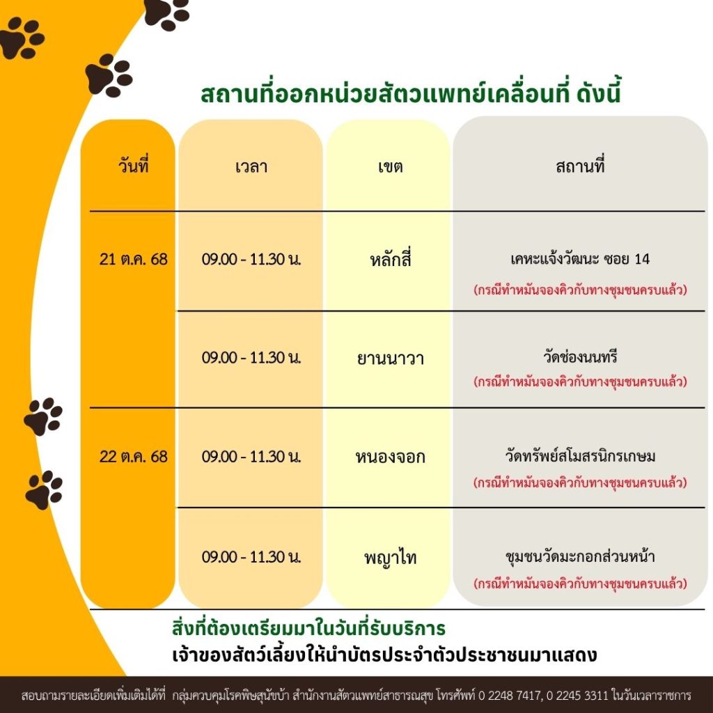 สำนักอนามัย กรุงเทพมหานคร ออกหน่วยสัตวแพทย์เคลื่อนที่ วันที่ 21 – 22 ตุลาคม 2568