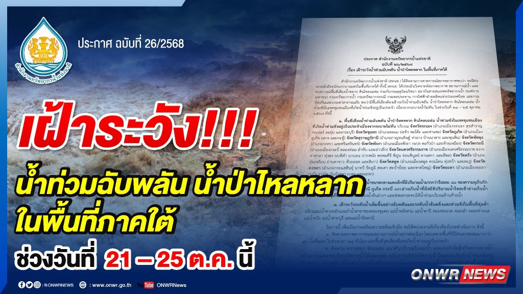 สำนักงานทรัพยากรน้ำแห่งชาติ เตือนเฝ้าระวังน้ำท่วมฉับพลัน น้ำป่าไหลหลาก ในพื้นที่ภาคใต้ ในช่วงวันที่ 21 – 25 ตุลาคม 2568