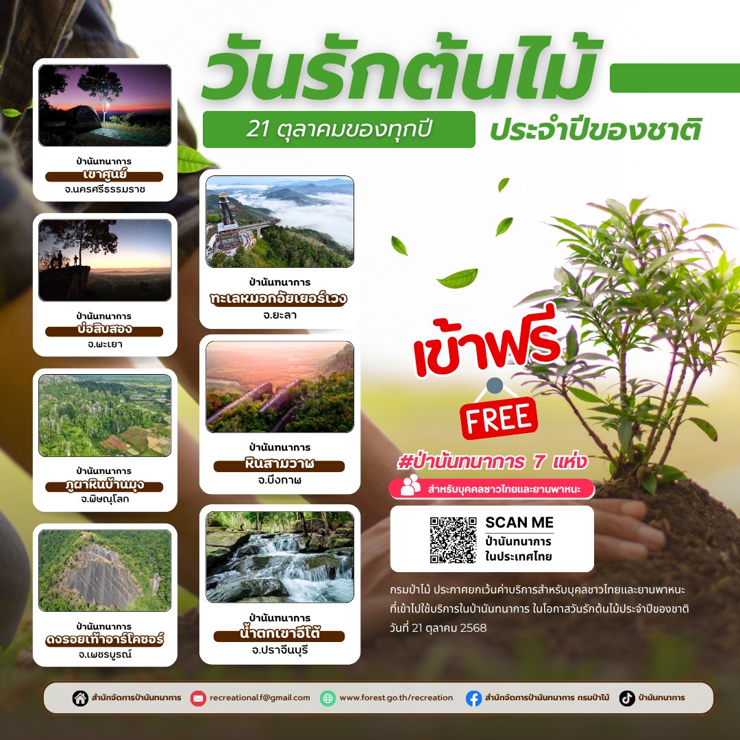 กรมป่าไม้ ประกาศยกเว้นค่าบริการ สำหรับบุคคลชาวไทยและยานพาหนะที่เข้าไปใช้บริการในป่านันทนาการ เนื่องในวันรักต้นไม้ประจำปีของชาติ เพื่อเฉลิมพระเกียรติ สมเด็จพระศรีนครินทราบรมราชชนนี (สมเด็จย่า) ซึ่งทรงมีพระราชปณิธานในการอนุรักษ์ทรัพยากรธรรมชาติและสิ่งแวดล้อม โดยเฉพาะ การปลูกและบำรุงรักษาต้นไม้ ให้คงอยู่คู่แผ่นดินไทย ในวันที่ 21 ตุลาคม 2568