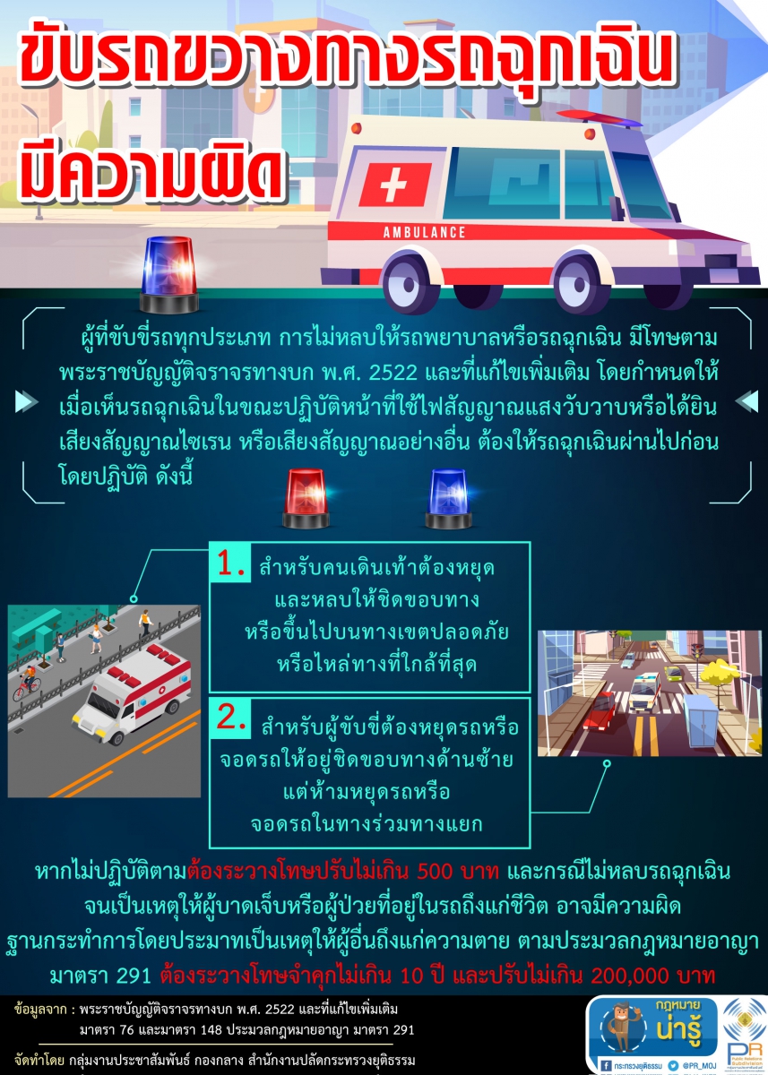 กระทรวงยุติธรรม แนะนำกฎหมายน่ารู้ ตอน ขับรถขวางทางรถฉุกเฉิน มีความผิด